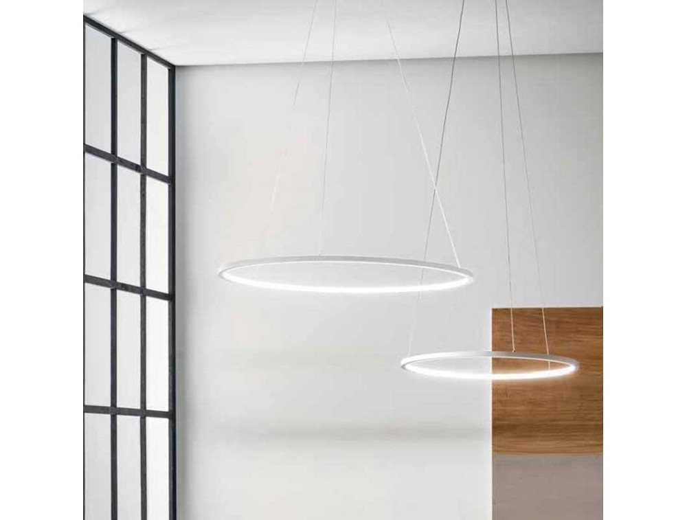 Sospensione ERIKA decentrabile con montatura in alluminio satinato bianco, diffusore in silicone bianco opale. dimmer e lampadina 3000K (non incluso).