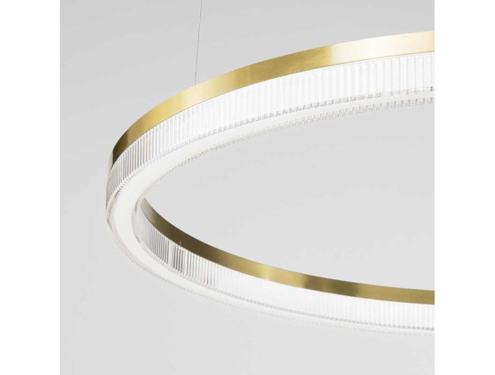 Rosone e montatura in metallo con finitura ottone spazzolato. Cavo in pvc nero. Diffusore in acrilico opale con elemento decorativo in acrilico trasparente con effetto cristallo molato.