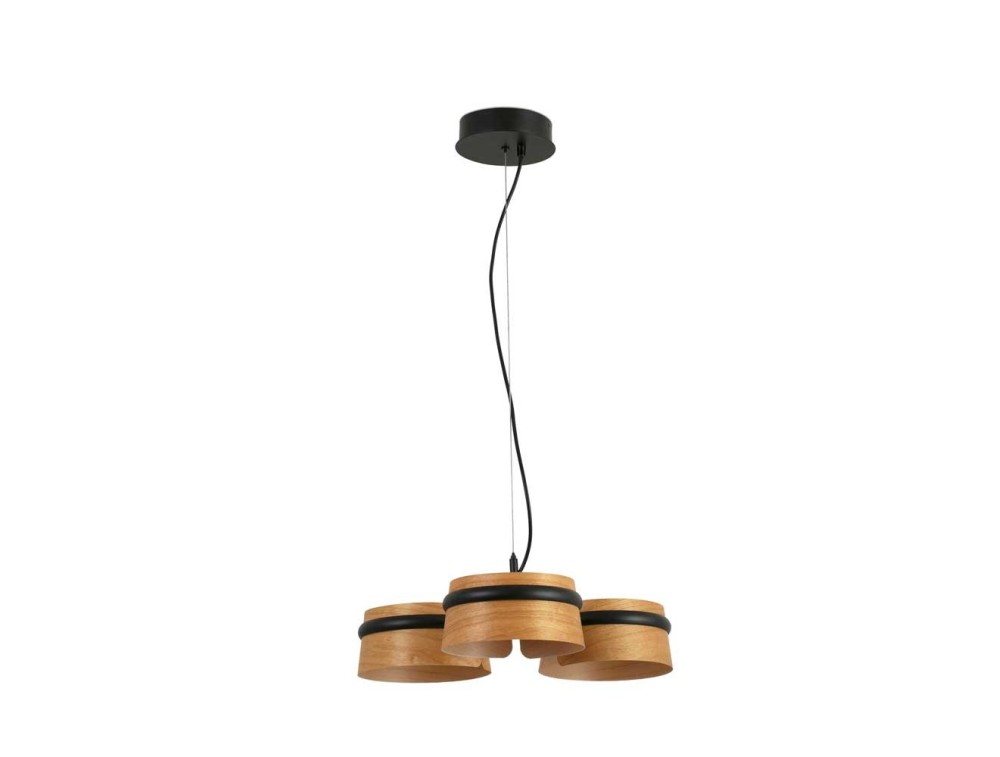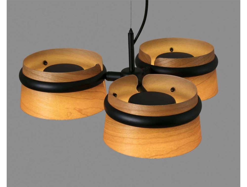 Lampada a sospensione realizzata con struttura in metallo nero e diffusori in legno.