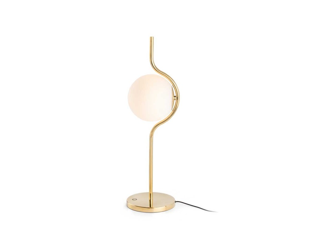Lampada da tavolo realizzata con struttura in alluminio iniettato color oro e diffusore in vetro opale. Funziona attraverso un sensore touch.