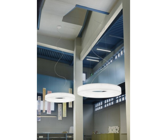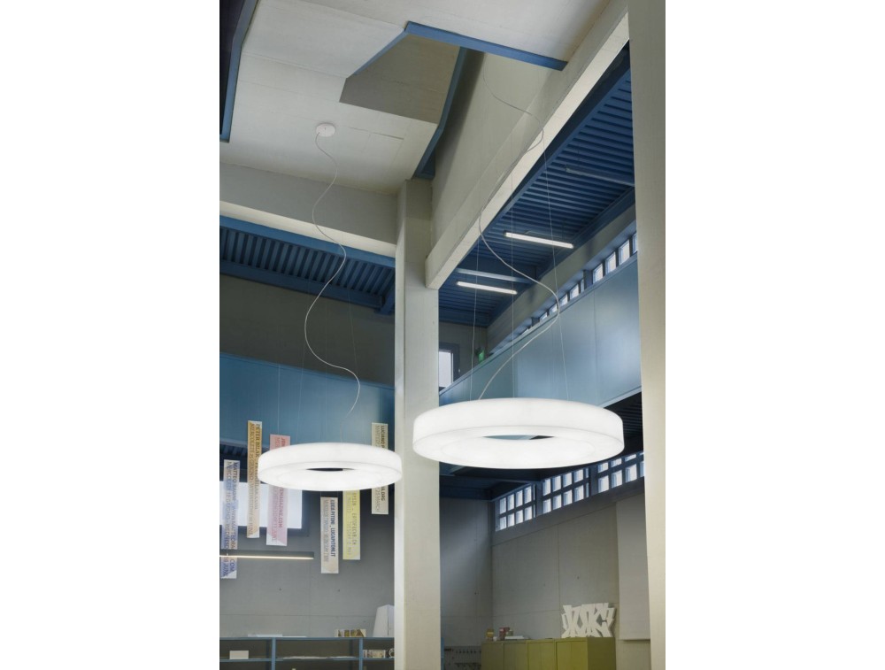 Sospensione a led realizzata con corpo in ferro e diffusore in polietilene di forma circolare forato al centro. Un anello plenario luminoso che fluttua sospeso nell'aria sommessa di ambienti ampi e spaziosi, perfetta per illuminare showroom, ampie hall di alberghi, spazi commerciali e grandi ambienti pubblici. Disponibile a luce calda o naturale.