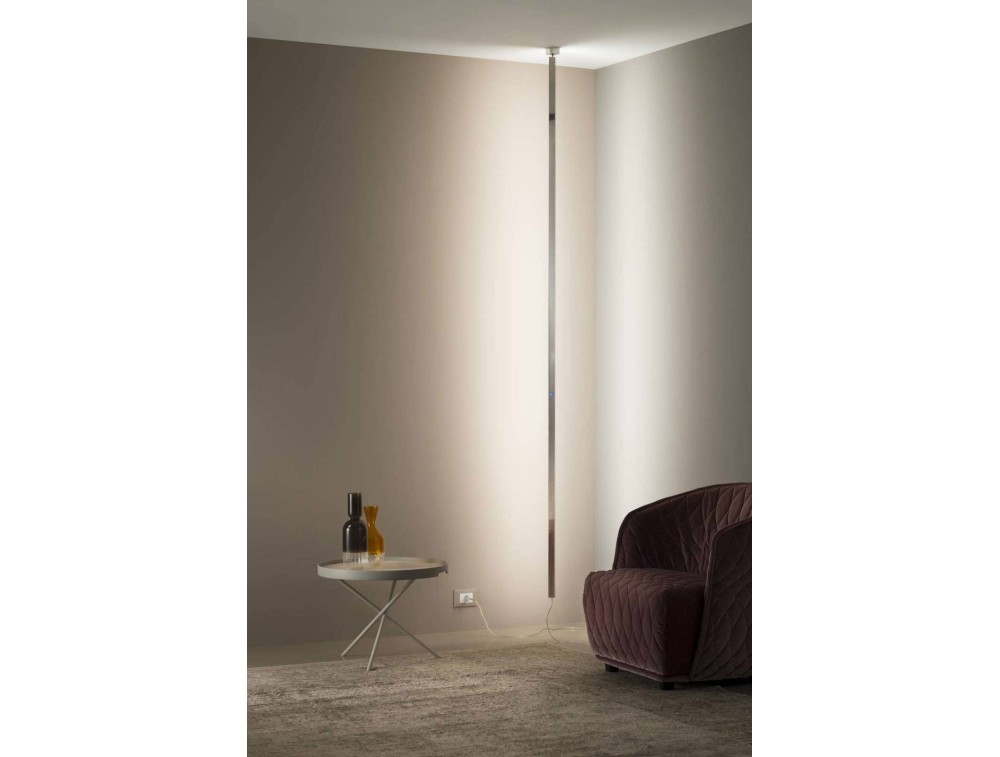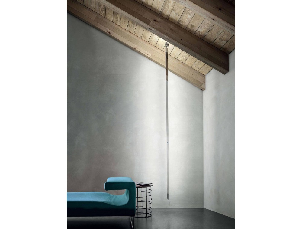 Sospensione a led formata un elemento rettilineo in materiale plastico (PMMA). Lampada con fissaggio a soffitto munita di interruttore touch, con emissione laterale della luce. Il corpo della lampada è rotabile di 350°. Lampada dal design lineare e moderno adatta ad ambienti con lo stesso stile di arredamento, perfetta in angoli di stanze che richiedono luce funzionale.