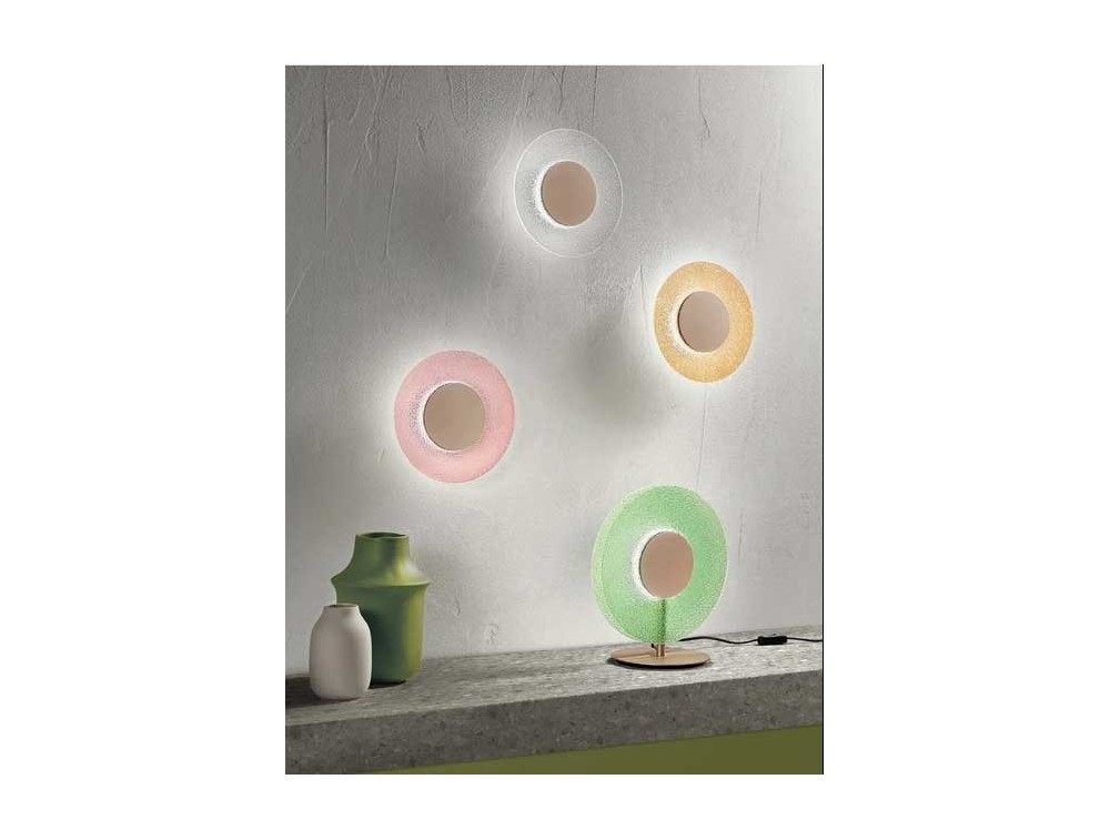 Ondaluce illuminazione, applique da parete, con struttura in metallo verniciato color oro e vetro circolare in graniglia. Disponibile, trasparente, verde, ambra e rosa.