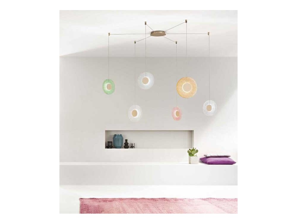 Realizzato in metallo verniciato e vetro graniglia colorato, con montatura in metallo verniciato oro. Si tratta di una lampadario in vetro con diffusori dalla forma circolare nelle nuance trasparente, verde, ambra e rosa, che dona alla stanza un'illuminazione diffusa ed intensa.