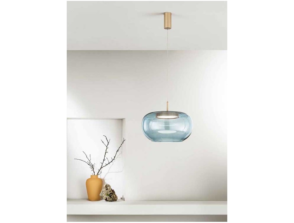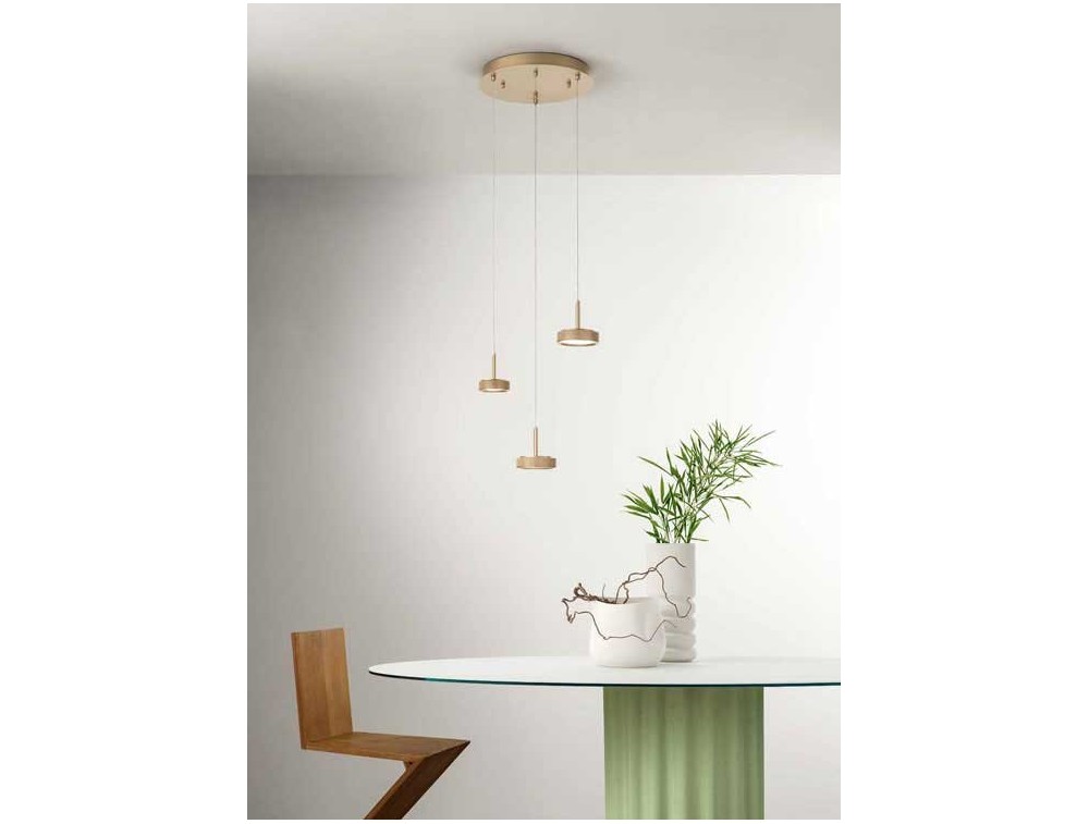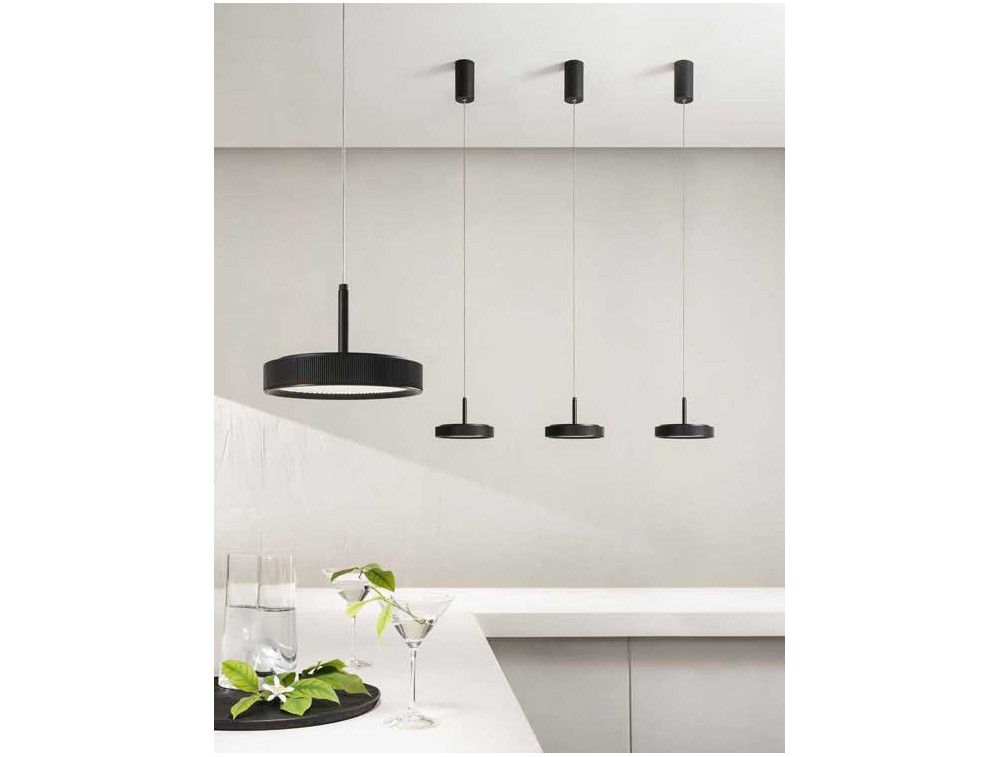Lampadario moderno e di design, versatile per ogni tipo di stanza, dalla camera da letto, al soggiorno, alla cucina. Ideale su un tavolo da pranzo o una penisola, per avere la giusta illuminazione verso il basso ed un elemento di decoro.