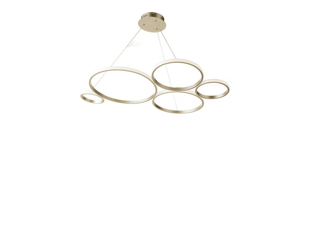 Lampadario led moderno della serie Pois molto originale realizzato in metallo di colore oro o in grigio argento composto da cerchi o anelli di diversa dimensione uniti tra loro e nelle varianti con luce led integrata 3000k o 4000k luce naturale.