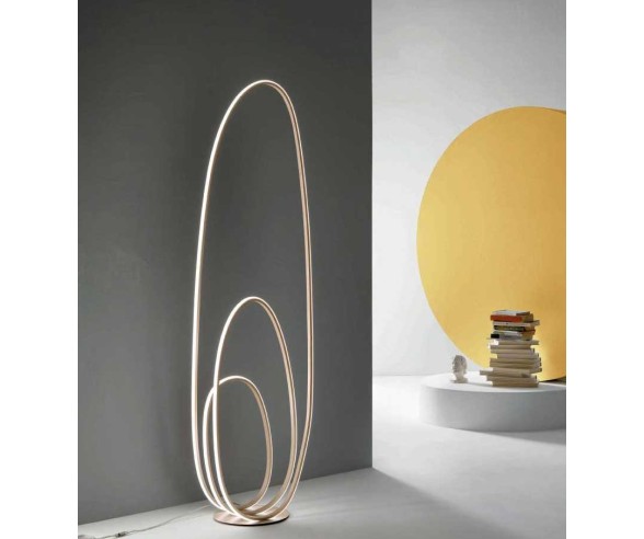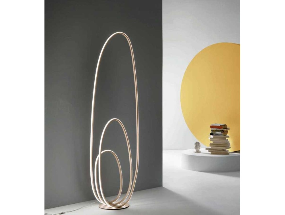 I tre anelli ovali in metallo dorato non solo attirano l'attenzione, ma diffondono anche una luce uniforme, ideale per arredare con stile salotti, soggiorni o camere da letto. La piantana ha una funzione dimmerabile per regolare l'intensità della luce.