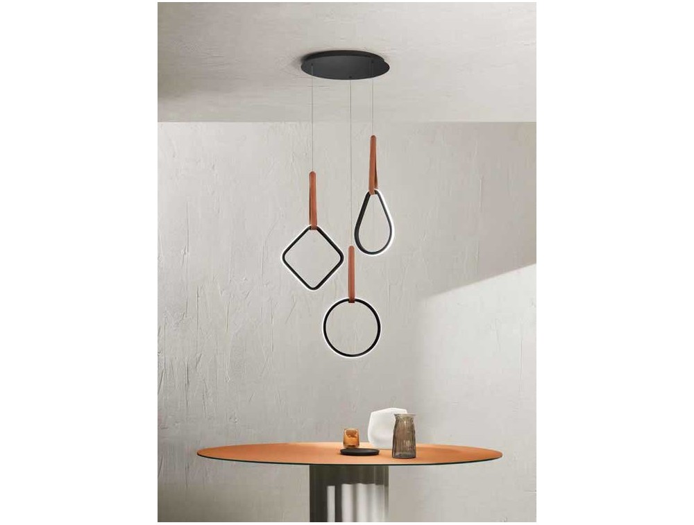 Lampada a sospensione Regoli realizzata in metallo Verniciato nero con dettaglio in ecopelle. Una lampada sospesa moderna particolarmente luminosa nonostante lo spessore molto sottile e il design minimalista.