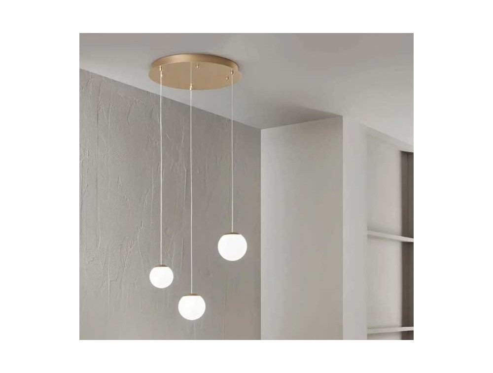 Lampadario a sospensione Santos realizzato con una struttura metallica verniciata di colore oro dove sono poste sfere di dimensioni differenti in vetro bianco satinato.