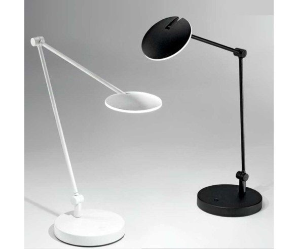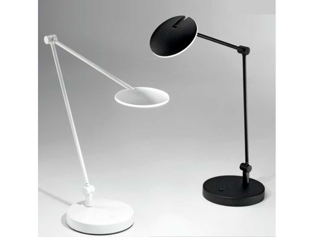 Lampada da tavolo orientabile in metallo verniciato a polvere colore bianco opaco o nero con diffusore in acrilico satinato
