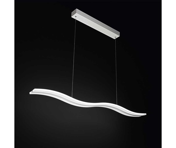 Sospensione sinuosa in metallo bianco e plexiglass con emissione di luce rivolta verso il basso e verso l'alto. Una lampadario di estrema semplicità da posizionare su qualsiasi piano di lavoro, tavolo da pranzo o di accoglienza come una reception.