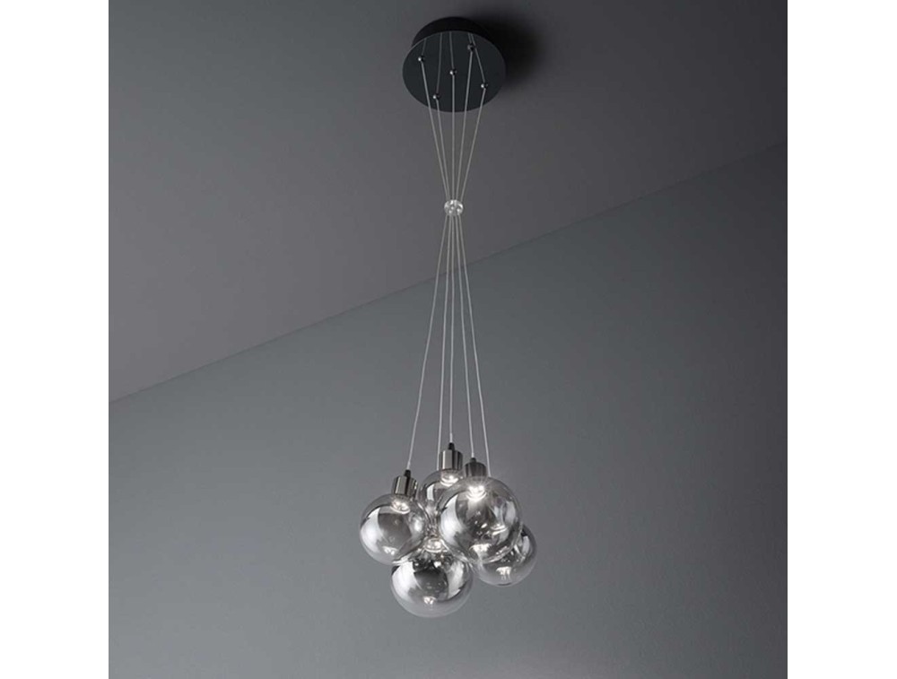 Grappolo lampada a sospensione in metallo finitura nero canna di fucile con diffusori sferici in vetro trasparente con sfumatura fumè specchiato, led intregrato per ogni sfera di 3 watt per un totale di 15w a luce calda, ideale per installazione in camera da letto, piccolo soggiorno, altezza dei diffusori regolabili.