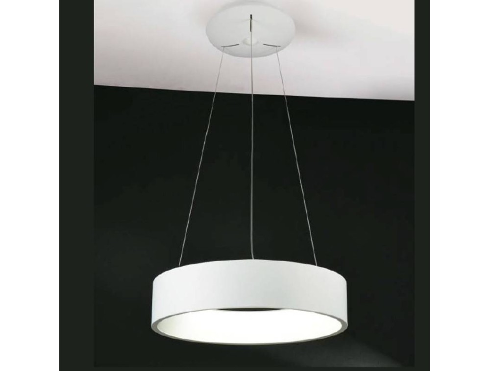 Sospensione moderna realizzata con struttura in metallo verniciato in finitura bianca e diffusore in acrilico. Lampada composta dal diffusore di forma circolare che contiene la sorgente led al suo interno sostenuta da tre cavi di sospensione regolabili. Lampada luminosa ed essenziale ideale in ambienti di design moderno di ogni dimensione.