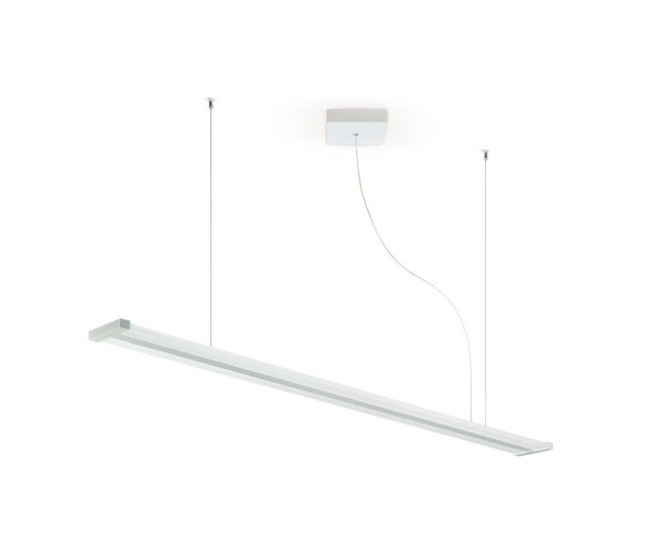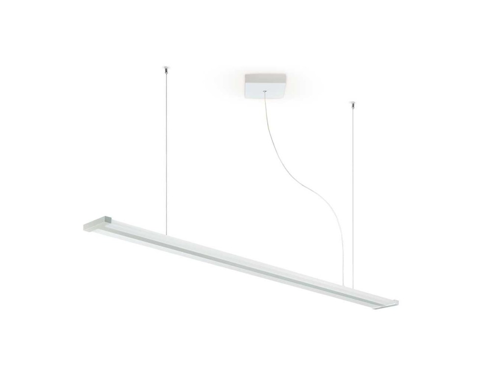Sospensione Line, diffusore disposto lungo i due lati esterni più lunghi, montato su una struttura in metallo verniciata di bianco opaco