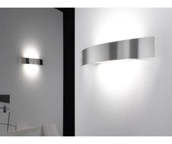Selene illuminazione, lampada da parete dalla forma ad arco realizzato con struttura e diffusore in lamiera rigata.