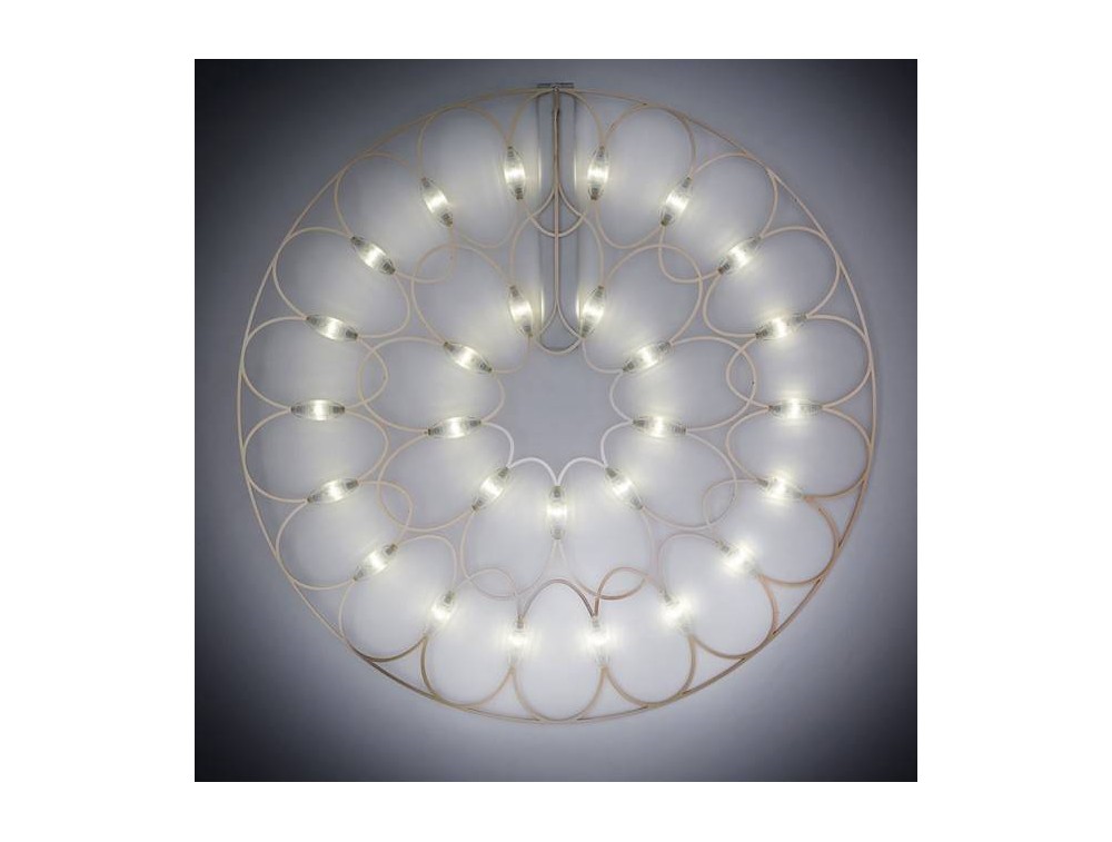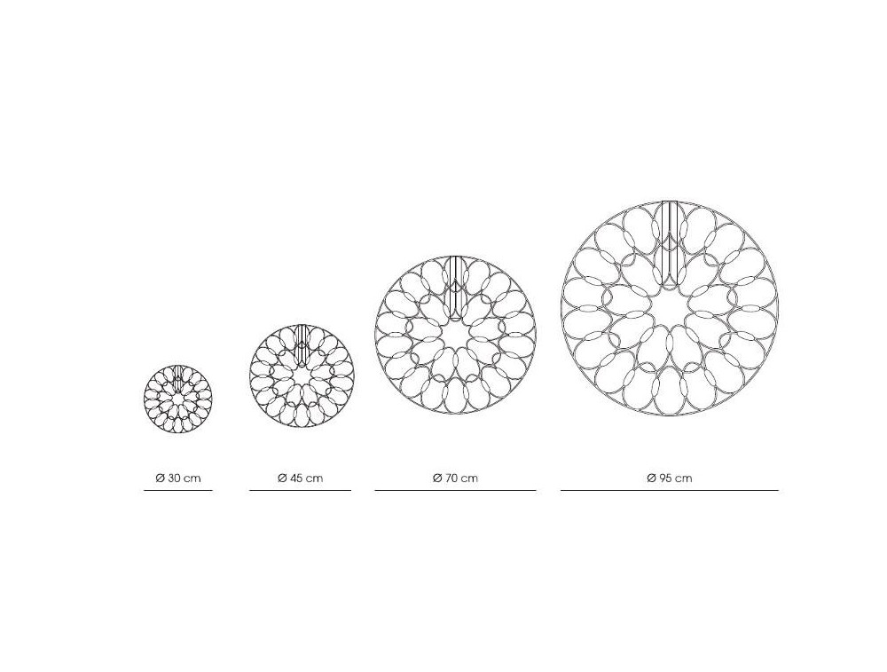 Applique realizzato con struttura interamente composta da metallo verniciato, disponibile nelle varianti di finiture oro o nero nickel. Lampada di grande impatto visivo dalla linea ricercata grazie alla composizione del diffusore che ricorda una rete metallica con dettagli circolari simmetrici contenenti le sorgenti led. Lampada che ricrea sulla parete un gioco di luci ed ombre che cattura l'attenzione dell'osservatore. Disponibile nella versione a sospensione.