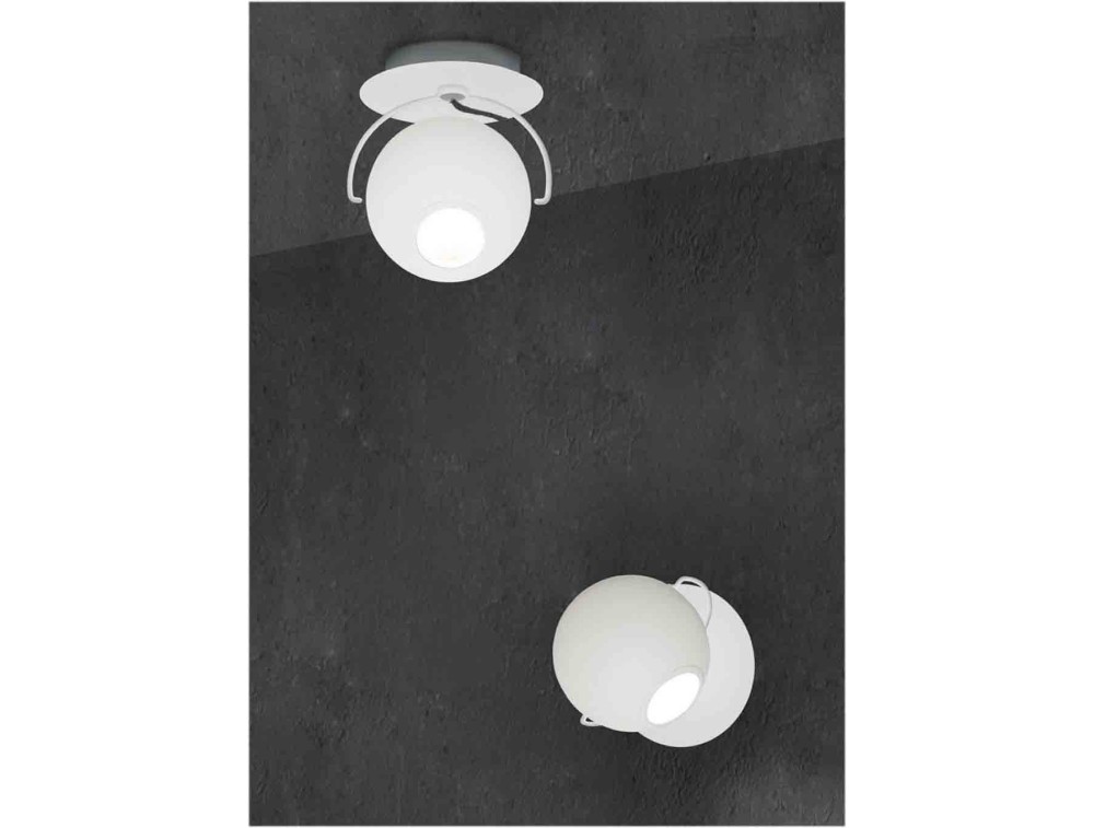 Applique o plafoniera realizzata con struttura e diffusore entrambi in metallo in finitura bianca. Lampada dal design moderno ed essenziale, una sfera contenente la sorgente luminosa a led che illumina in maniera diretta un preciso spot ed in maniera indiretta tutto l'ambiente. Lampada ideale in bagni, corridoi, camere da letto, living room e salotti di design moderno.