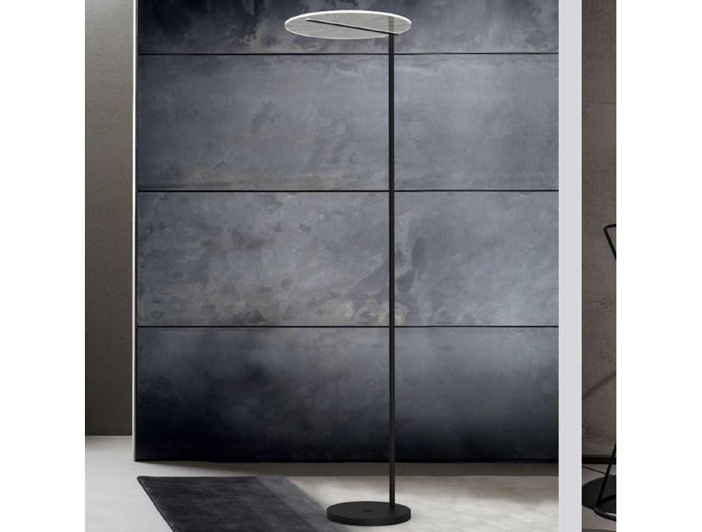Piantana che illumina e arreda la stanza. Una lampada da terra con montatura in metallo nero o oro e diffusore in acrilico trasparente.