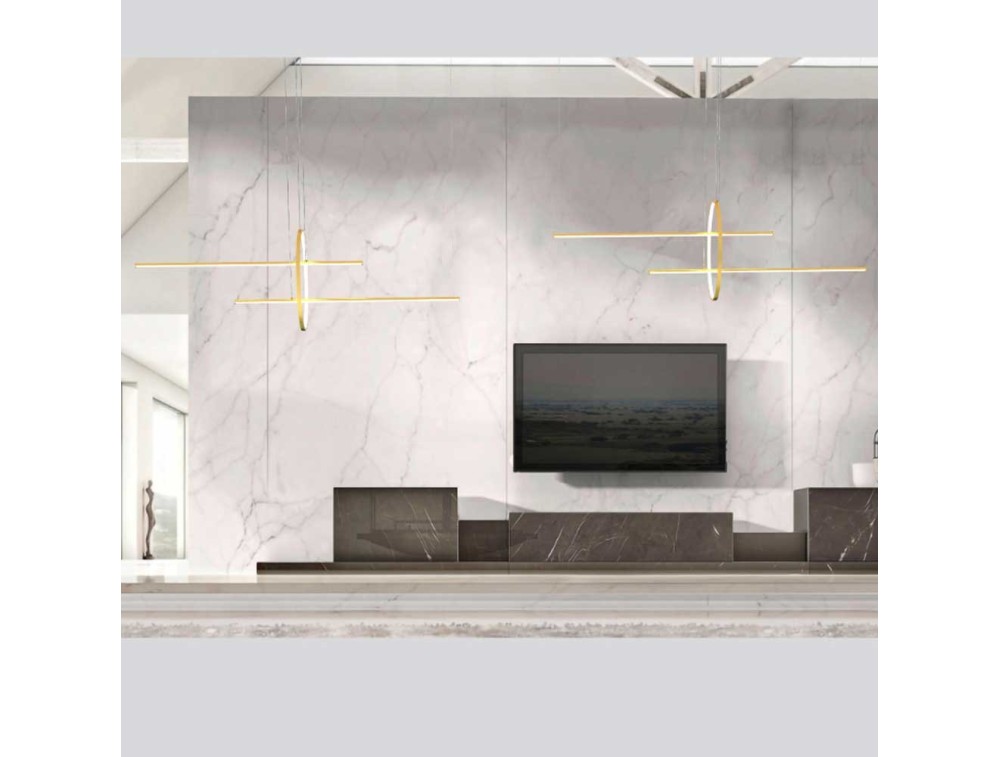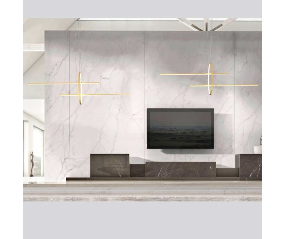 Sospensione sinuosa dal design ultramoderno. Con montatura in alluminio e diffusore in acrilico, nella versione dorata.