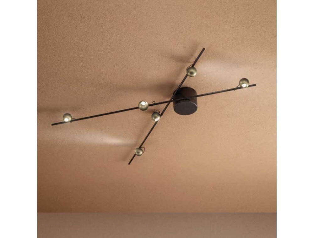 Plafoniera Magnetic LED del brand italiano Sil Lux con sei luci, e due bracci che possono essere allineati a piacere, cosi da renderla perfetta per la tua cucina, salotto e camera da letto. Strutturata in metallo bronzo e con diffusori oro spazzolato magnetici, cosi da personalizzare il design.