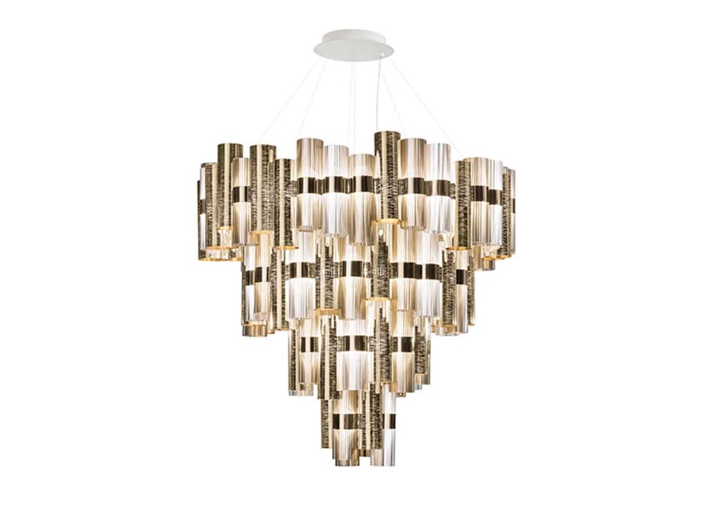 Tributo ai meravigliosi anni ‘50, La Lollo e La Lollona risvegliano nell’immaginario una storia di dive e riflettori. Gradienti cromatici, metallizzazioni, merletti e disegni geometrici decorano gli interni con la stessa versatilità con cui un gioiello adorna il corpo di una donna. Nella La Lollona 5 si arriva a 130 cm di diametro per un totale di 132 cilindri realizzati con i tecnopolimeri unici ed esclusivi di Slamp.