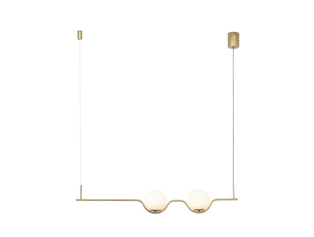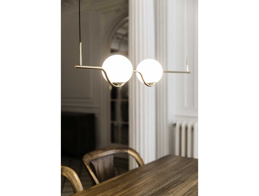 Lampada a sospensione realizzata con struttura in alluminio iniettato color oro e diffusore in vetro opale.