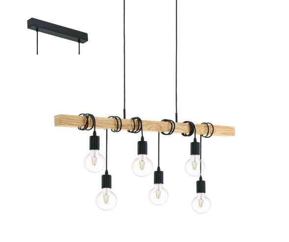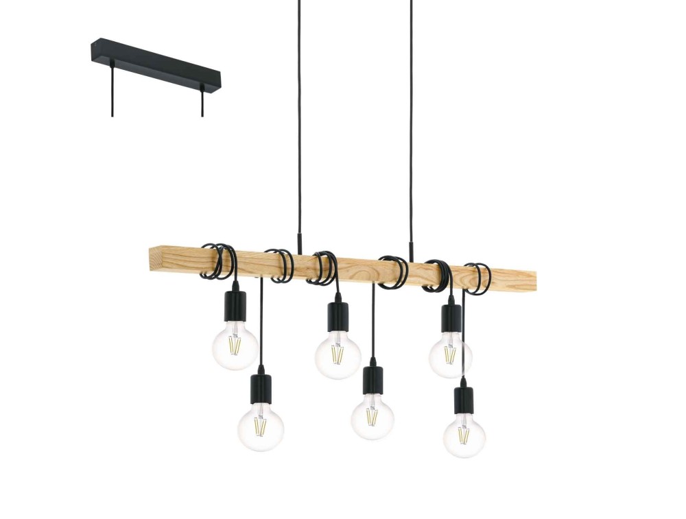 Eglo lampadari, sospensione rustica realizzata con struttura in acciaio in finitura nera e legno.