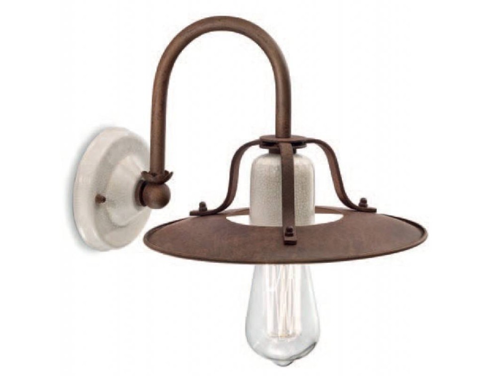 Ferroluce applique realizzato con struttura in metallo in finitura ruggine e diffusore in ceramica craquelè. Lampada dalle forme pulite ed essenziali che richiamano lo stile rustico americano grazia all'utilizzo dei materiali come il metallo e la ceramica. Ideale in ambienti dove richiesta luce senza schermature di design rustico.