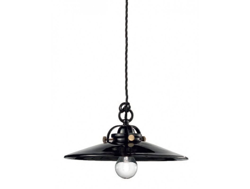 Sospensione realizzata con struttura e diffusore in lamiera di metallo smaltata lucida. Colori netti e superfici lucide per un profilo dalla presenza attuale pur conservando la memoria di uno stile passato. Le viti di supporto diventano un dettaglio prezioso grazie alla finitura dorata che ne evidenzia la presenza e dunque la funzione.