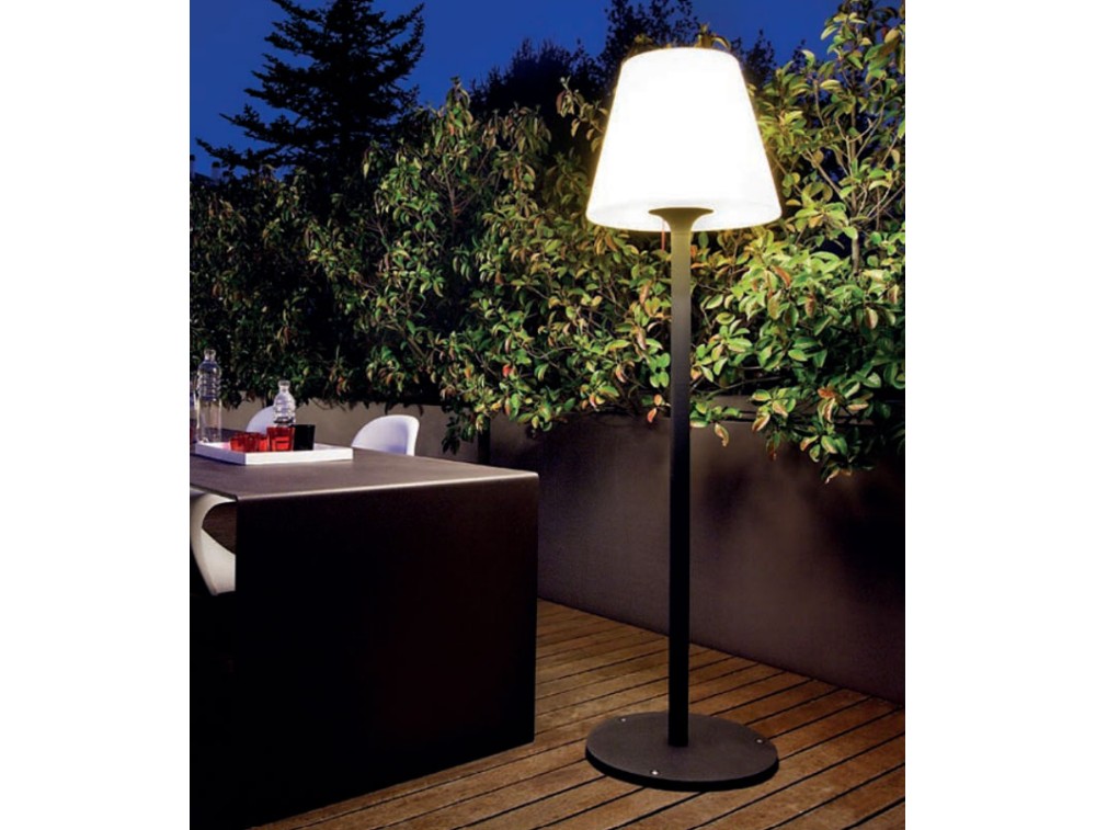 Lampada da terra per esterno, strutturata in metallo verniciato a polveri grigio scuro, diffusore in polietilene bianco, resistente ai raggi UV