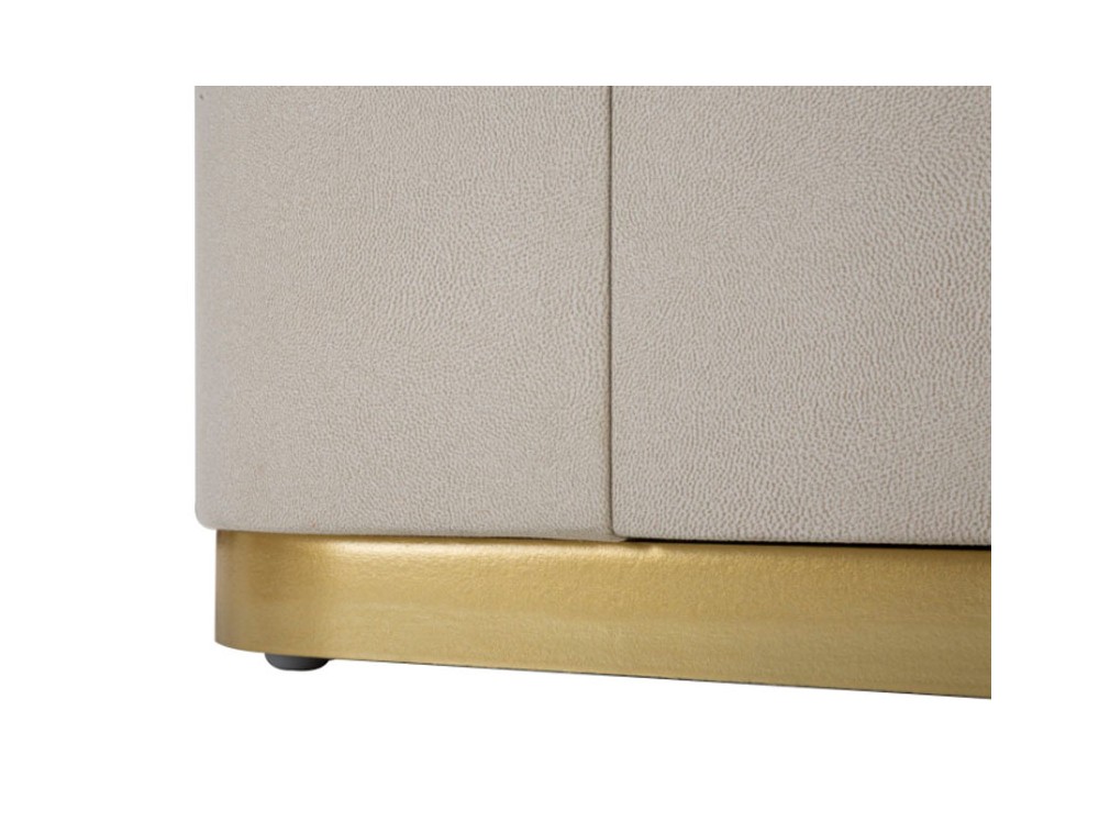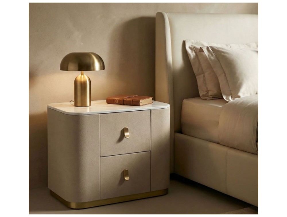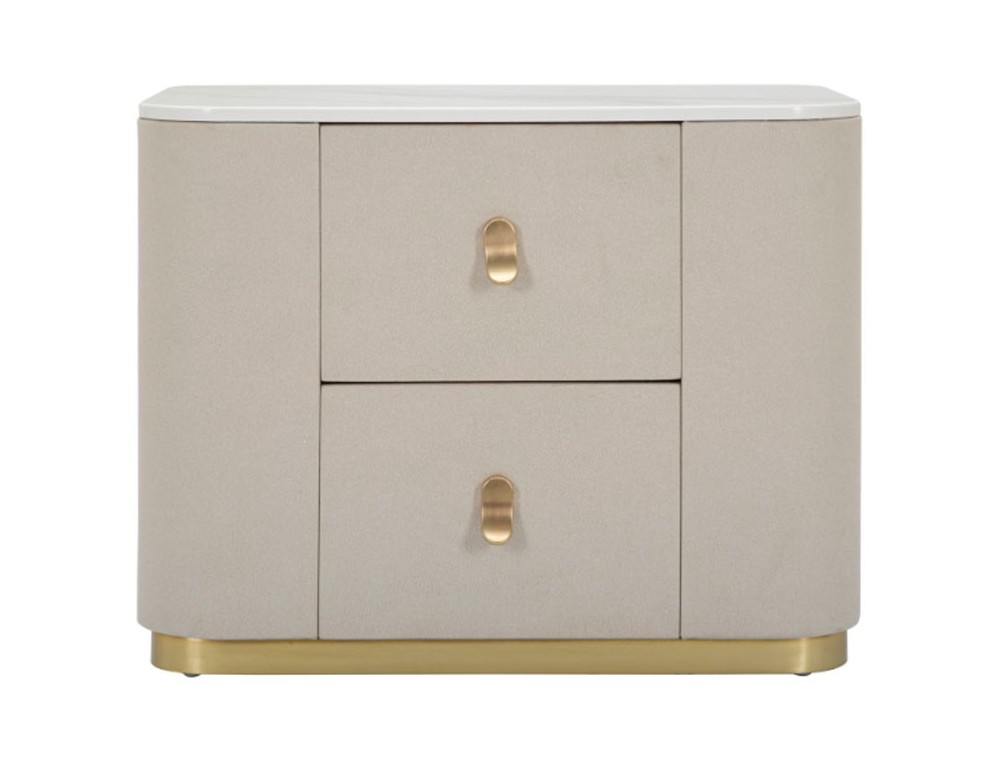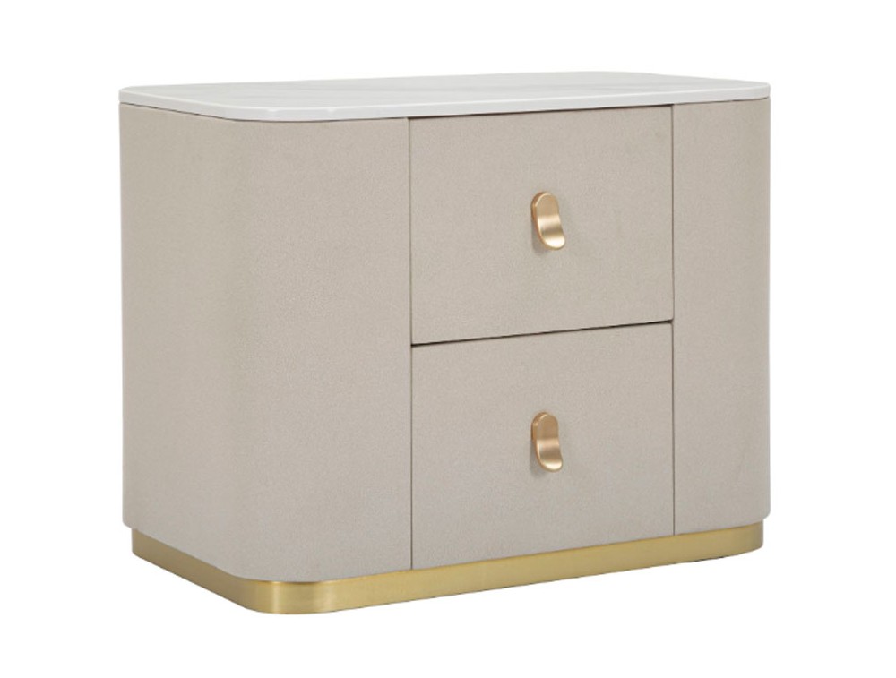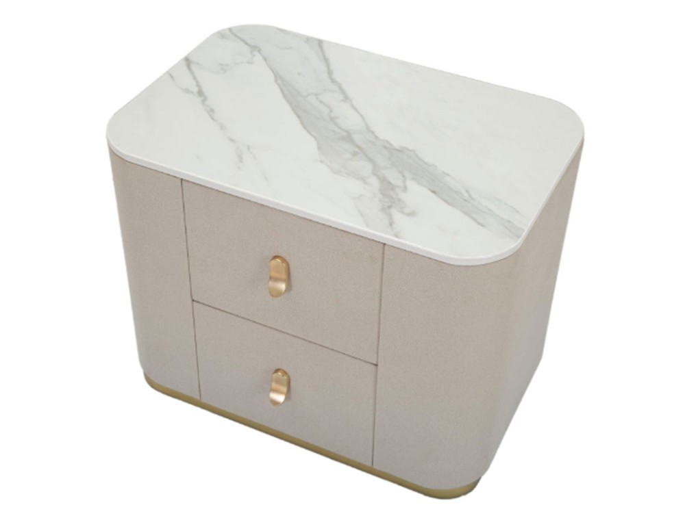 Comodino in tessuto bianco con piano in simil marmo completo di 2 cassetti. Le maniglie e le rifiniture dorate donano un tocco di eleganza. Realizzata in legno di pino, metallo e pannello di fibra a media densità.