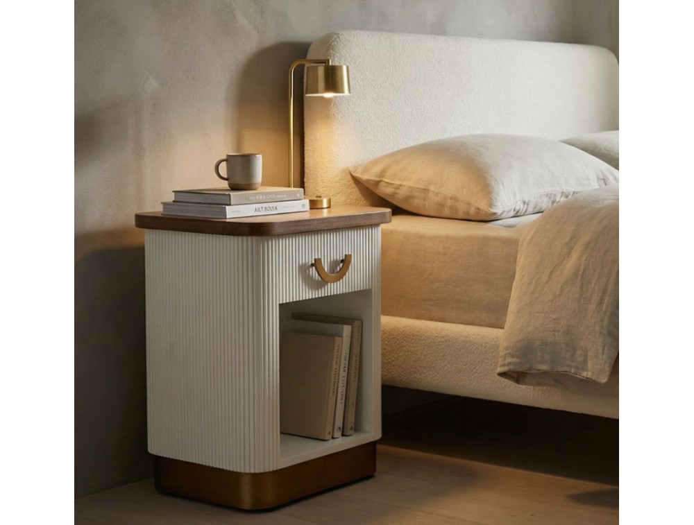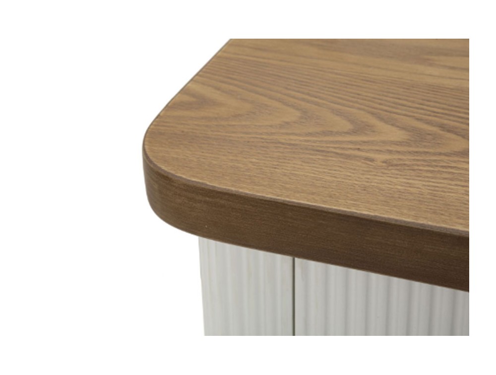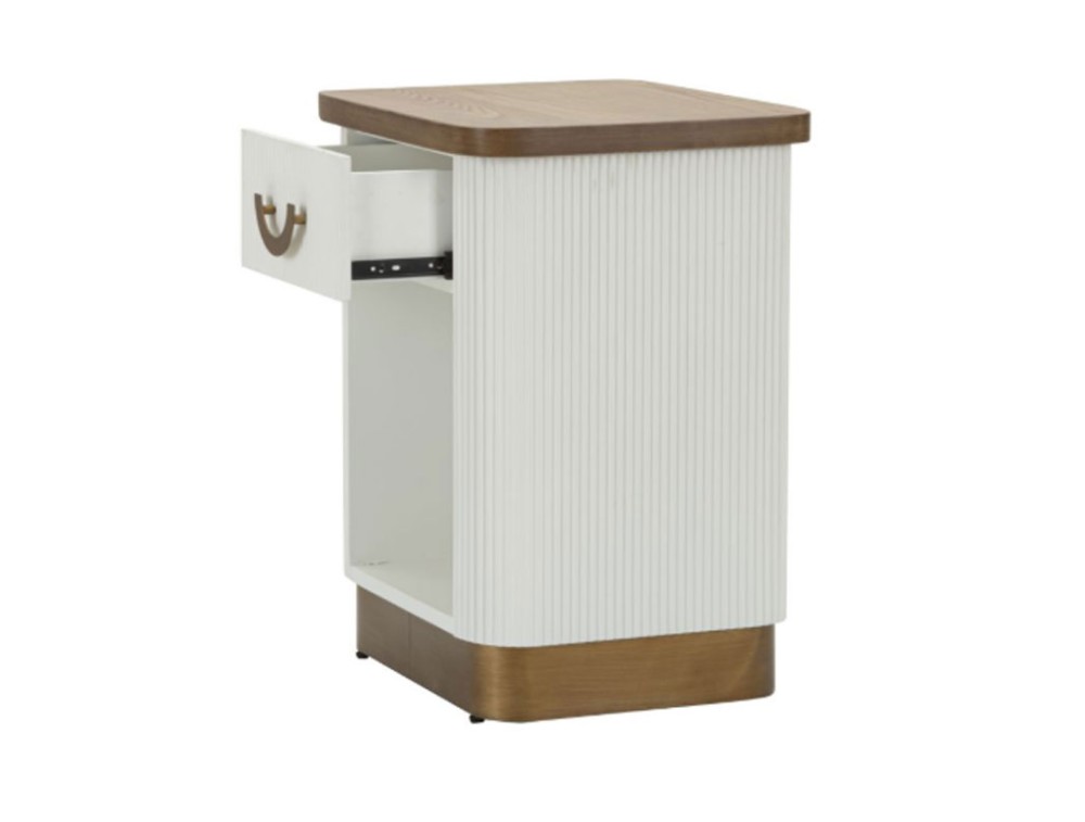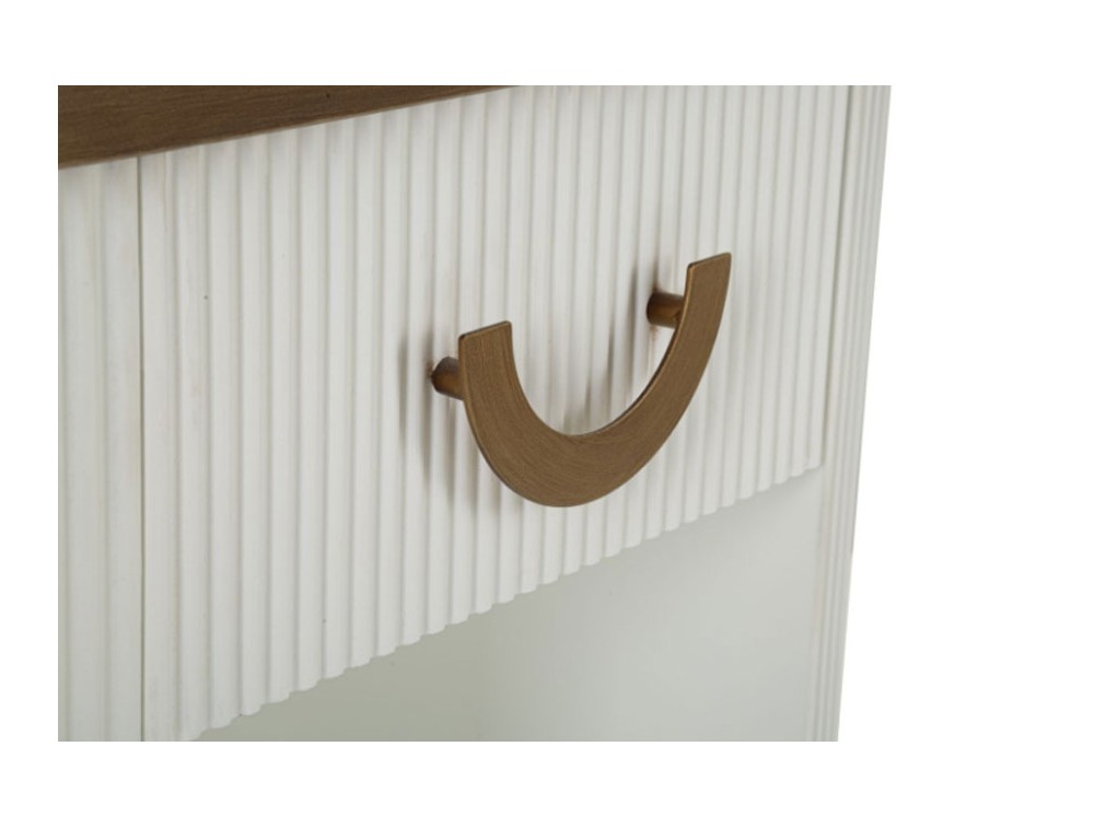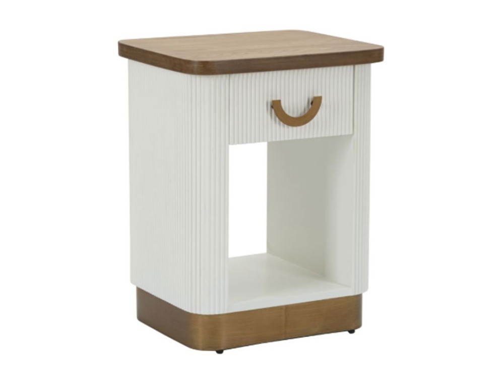Comodino in legno bianco con piano e inserti in legno marrone dal design arrotondato. Finemente decorato con linee in rilievo. Completo di cassetto e ripiano. Realizzato in legno di frassino, pannelli di fibra a media densità e ferro.