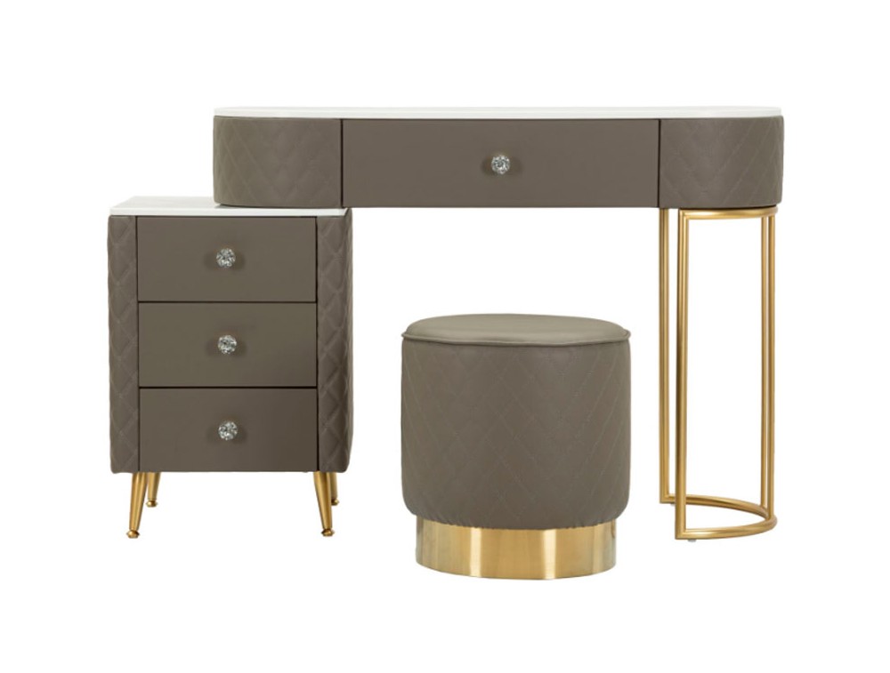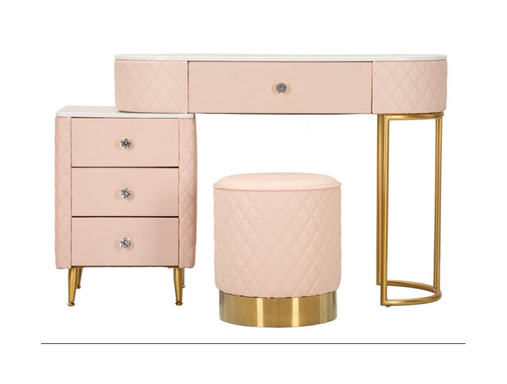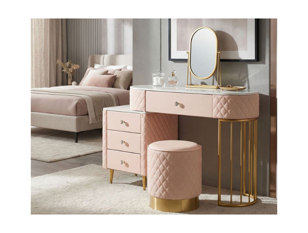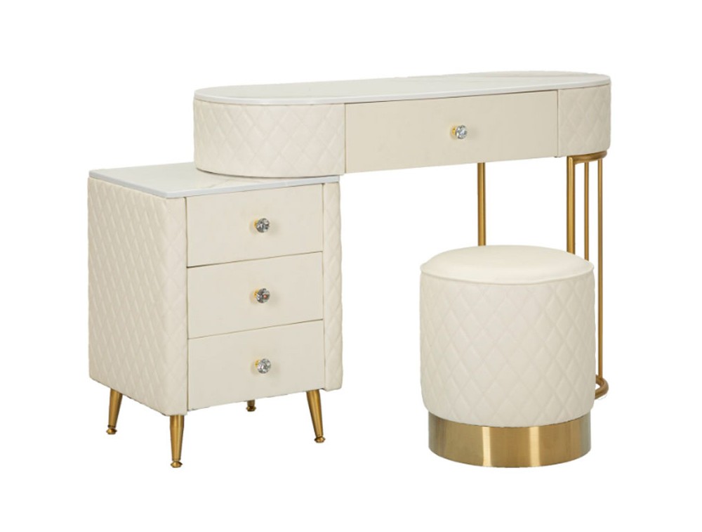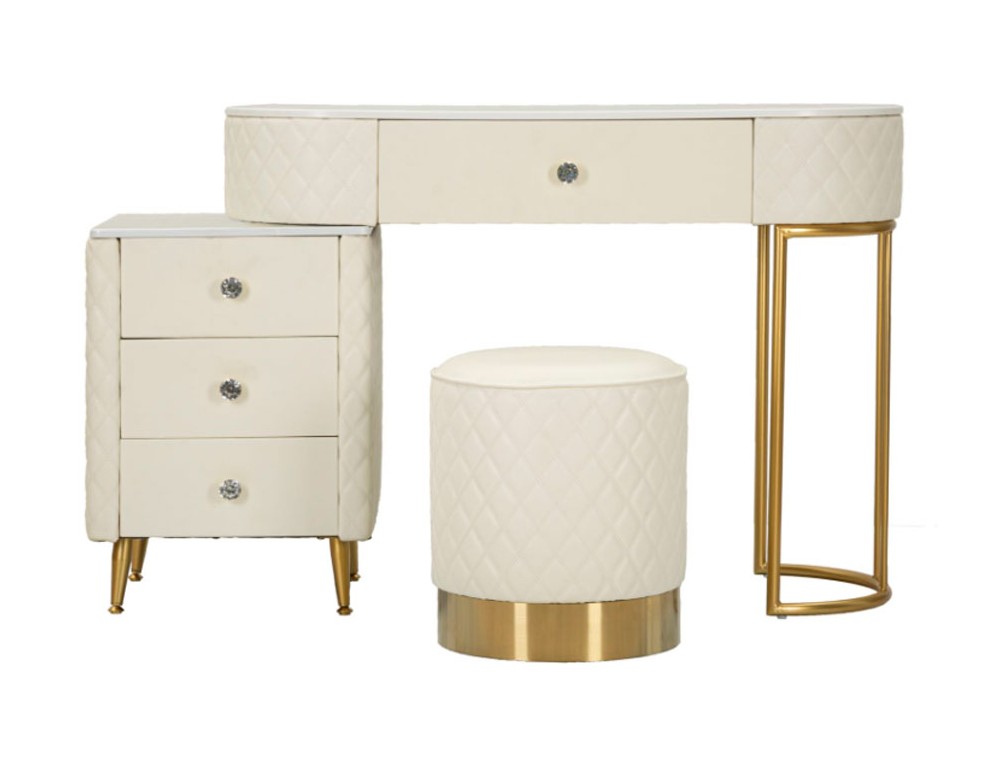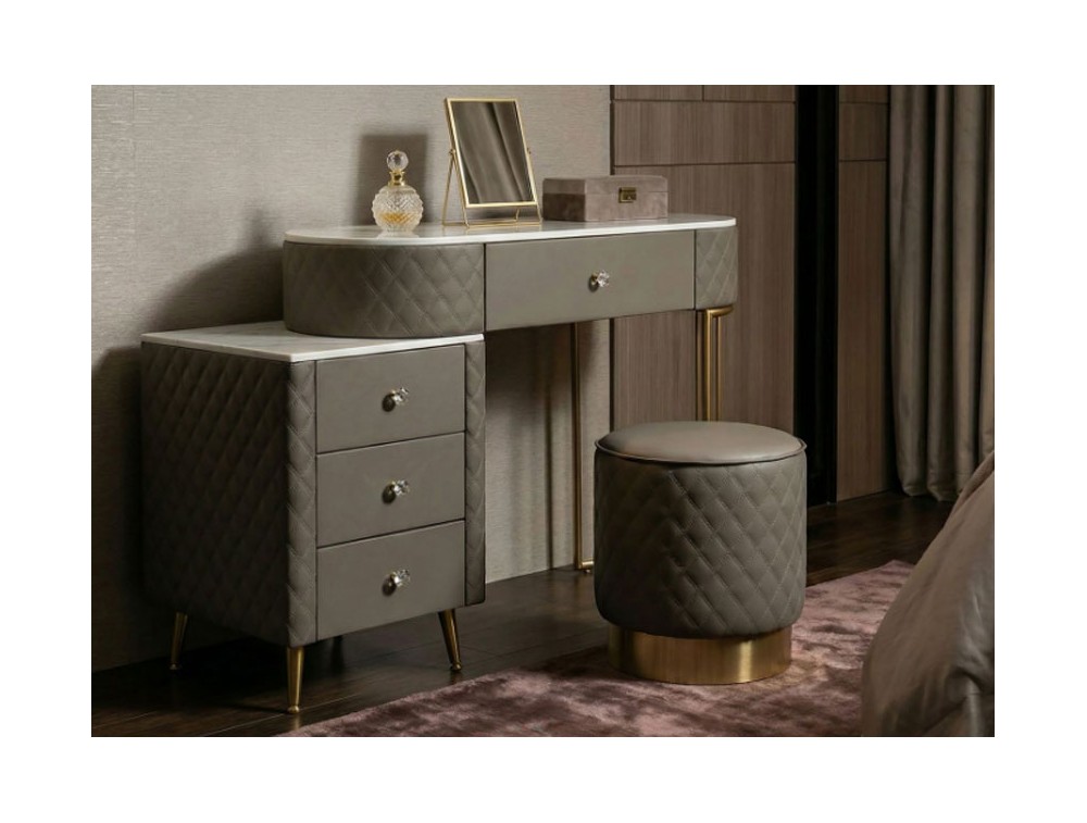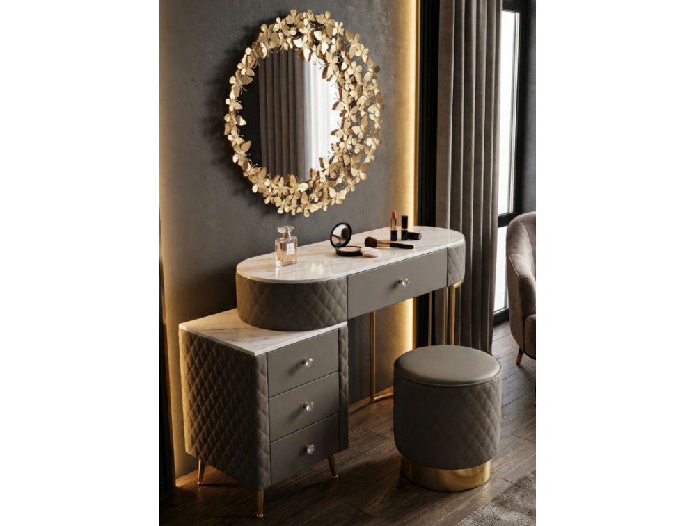 Una toeletta lussuosa e raffinata in simil pelle trapuntata e struttura in metallo dorato o argentato, il top in simil marmo suggerisce lusso, e i pomelli diamantati brillano di glamour. Completa di puff rotondo in simil pelle trapuntata con base in metallo dorato. Realizzata in legno di pino, pannello di fibra a media densità, metallo e plastica.