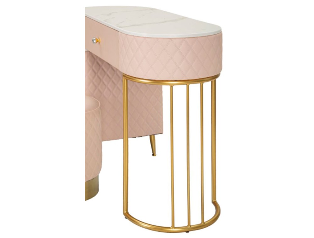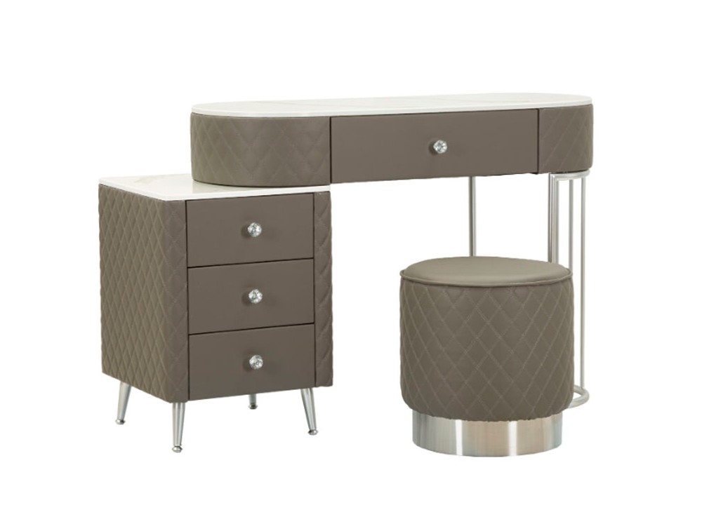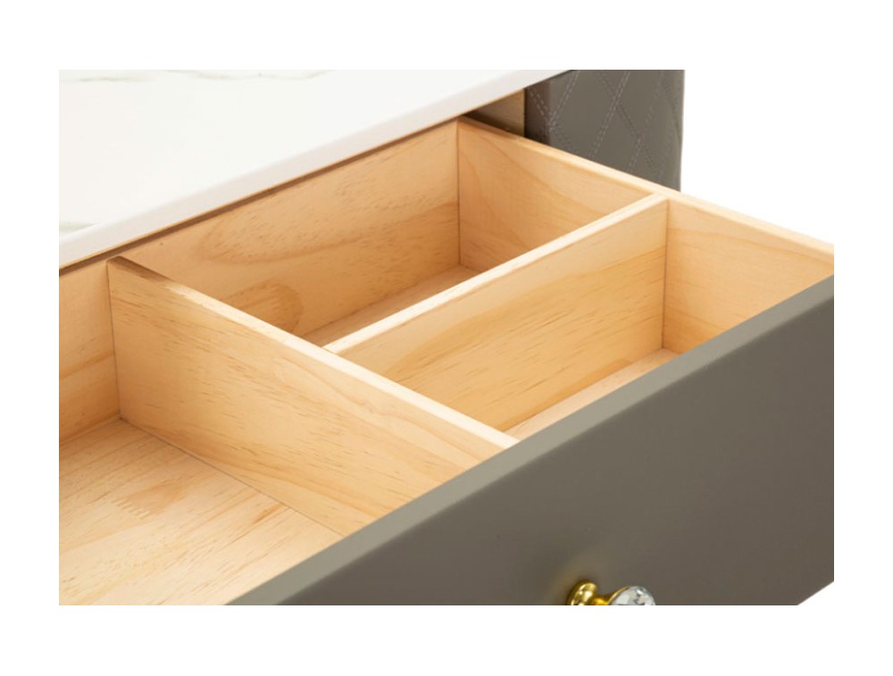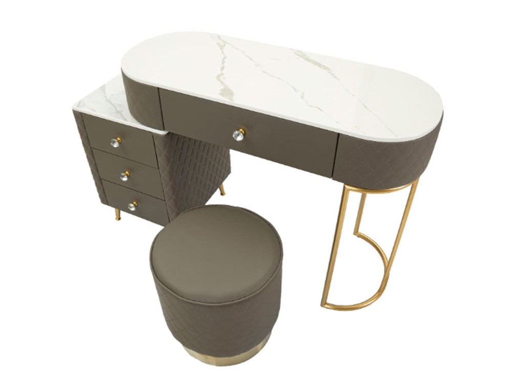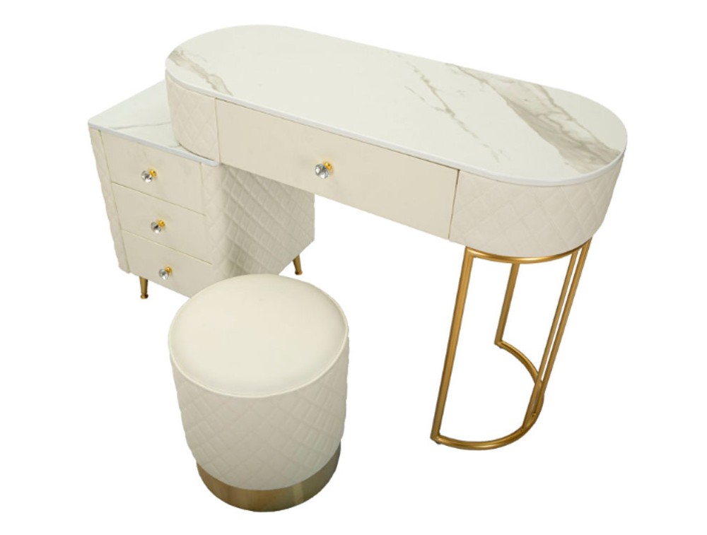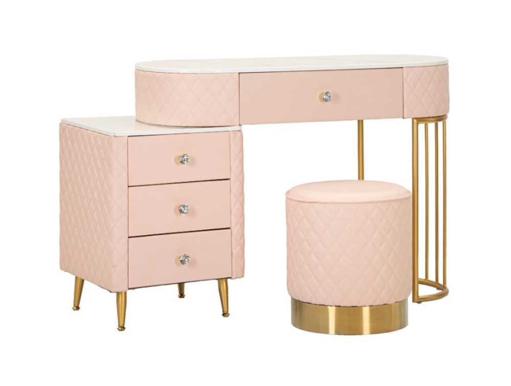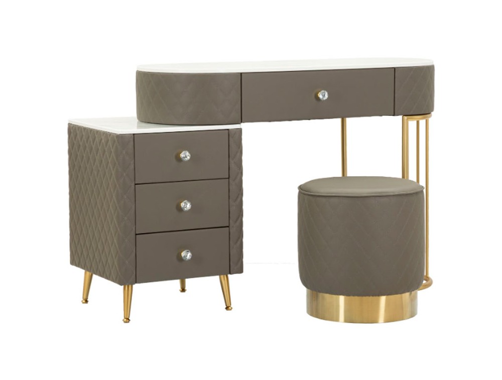 Una toeletta lussuosa e raffinata in simil pelle trapuntata e struttura in metallo dorato o argentato, il top in simil marmo suggerisce lusso, e i pomelli diamantati brillano di glamour. Completa di puff rotondo in simil pelle trapuntata con base in metallo dorato. Realizzata in legno di pino, pannello di fibra a media densità, metallo e plastica.