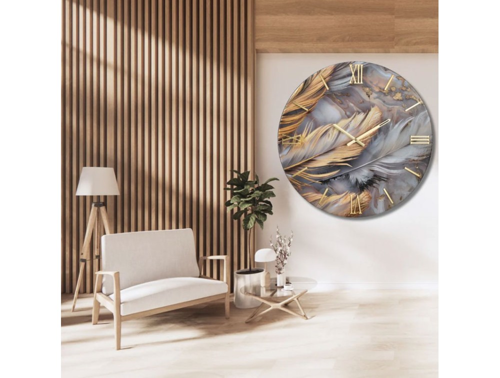Orologio circolare in legno con colata di resina con quadrante lucido, decorato a mano con foglia oro e numeri sovrapposti in Plexiglass lucido con effetto specchio. Lancette in metallo lucido.