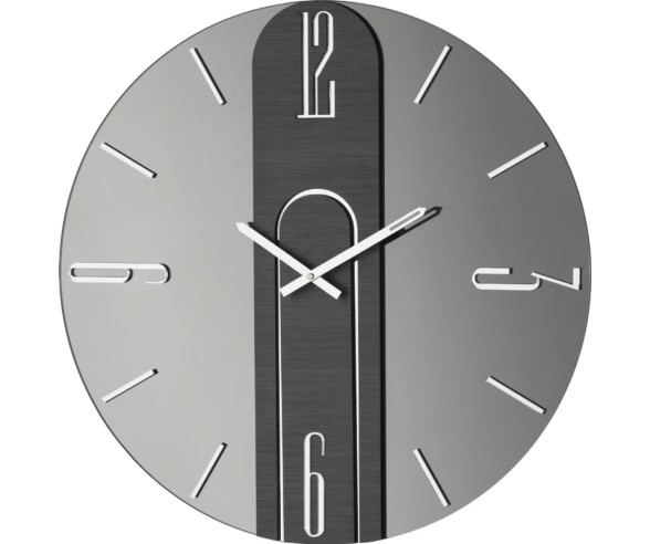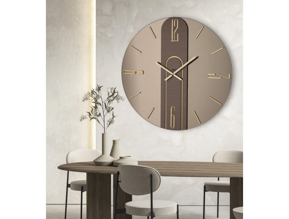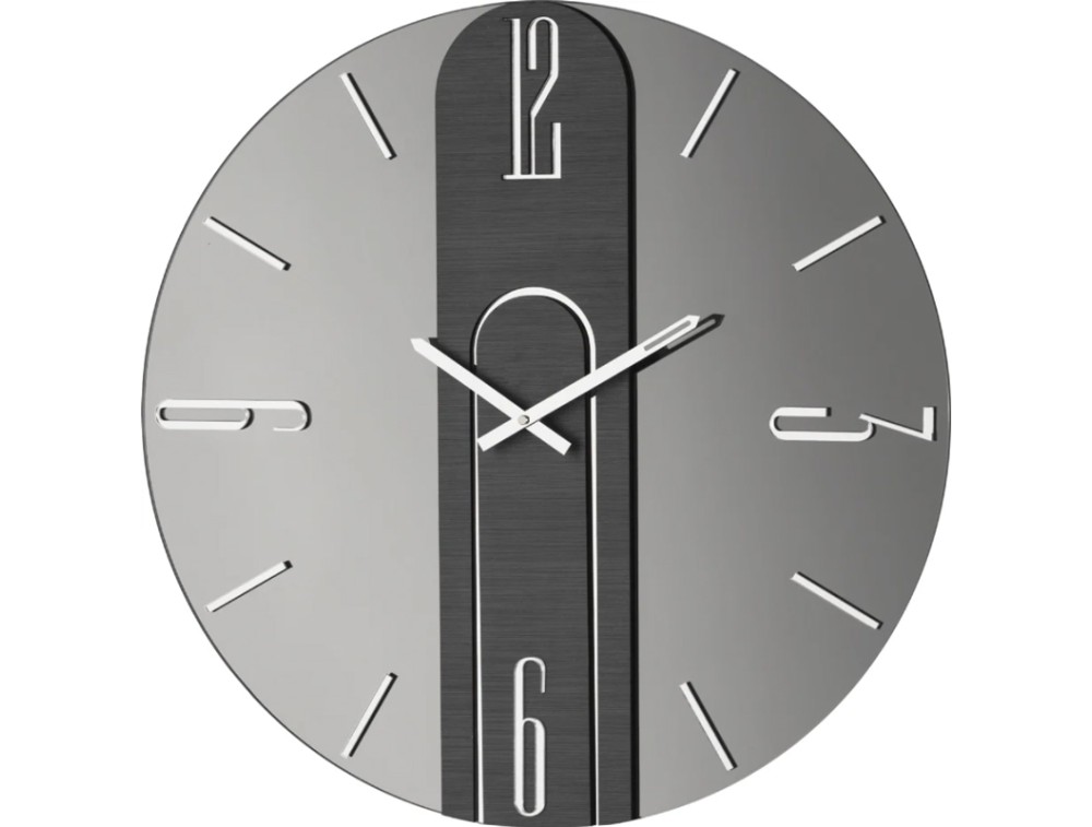 Orologio circolare in vetro specchiato fumee o bronzo con applicazione centrale in CAST in effetto metallizzato. Numeri in plex. Lancette in metallo lucido. Orologio Made in Italy con meccanismo Contini Firenze. Ideale per ambienti come soggiorni o ingressi eleganti.