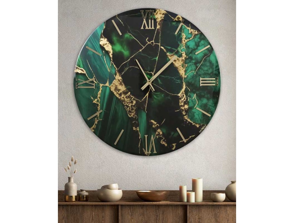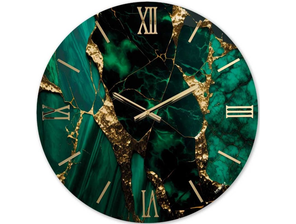 Realizzato a mano in Italia con una forte espressività decorativa. La base in legno è rivestita da una colata di resina epossidica effetto marmo verde, arricchita da venature dinamiche in foglia oro applicata a mano, che donano brillantezza e profondità. Ogni esemplare è unico, con una superficie resistente ai raggi UV che ne preserva la luminosità nel tempo. I numeri romani in plexiglass oro specchiato e le lancette in metallo cromato oro completano il design con un tocco elegante e prezioso. Dotato di meccanismo Contini Firenze.