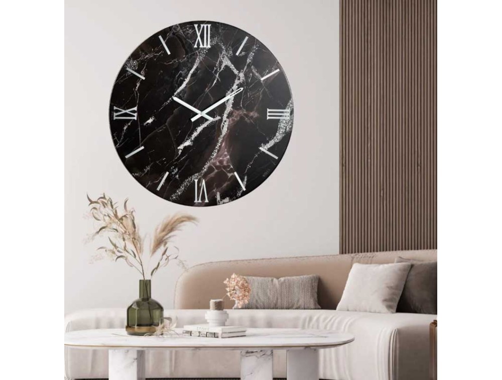 Unisce eleganza e intensità visiva, perfetto per ambienti moderni dal gusto sofisticato. Presenta una superficie in resina effetto marmo nero, arricchita da un prezioso decoro in foglia argento che dona luminosità e profondità, trasformandolo in un vero elemento decorativo. I numeri romani in plexiglass specchiato argento si fondono con armonia nel disegno, mentre le lancette in metallo cromato silver completano il tutto con uno stile sobrio e contemporaneo. Un complemento perfetto per pareti che richiedono carattere e raffinatezza. Meccanismo Made in Italy