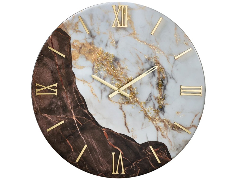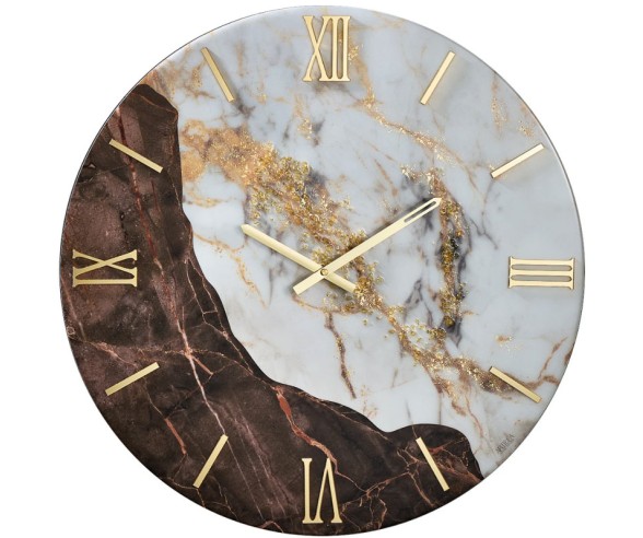 Un orologio da parete compatto e decorativo che unisce funzionalità e forte impatto estetico, ideale per ambienti che cercano un elemento distintivo. Dal design moderno e particolare. Su base in legno HDF con quadrante circolare lucido, decorato a mano con foglia oro e cristalli che creano un raffinato gioco di luce su una superficie effetto marmo nei toni avorio e marrone. I numeri romani in plexiglass oro specchiato, sovrapposti con effetto tridimensionale, donano eleganza e profondità, mentre le lancette in metallo lucido cromato oro completano il tutto con brillante sobrietà. Meccanismo Made in Italy