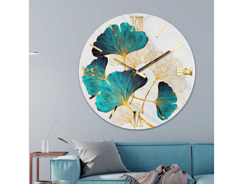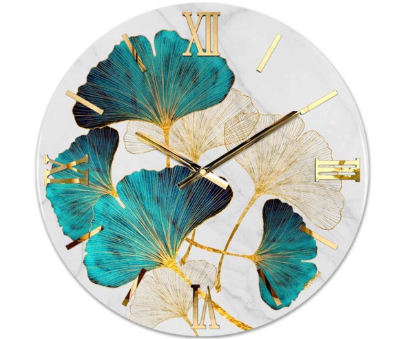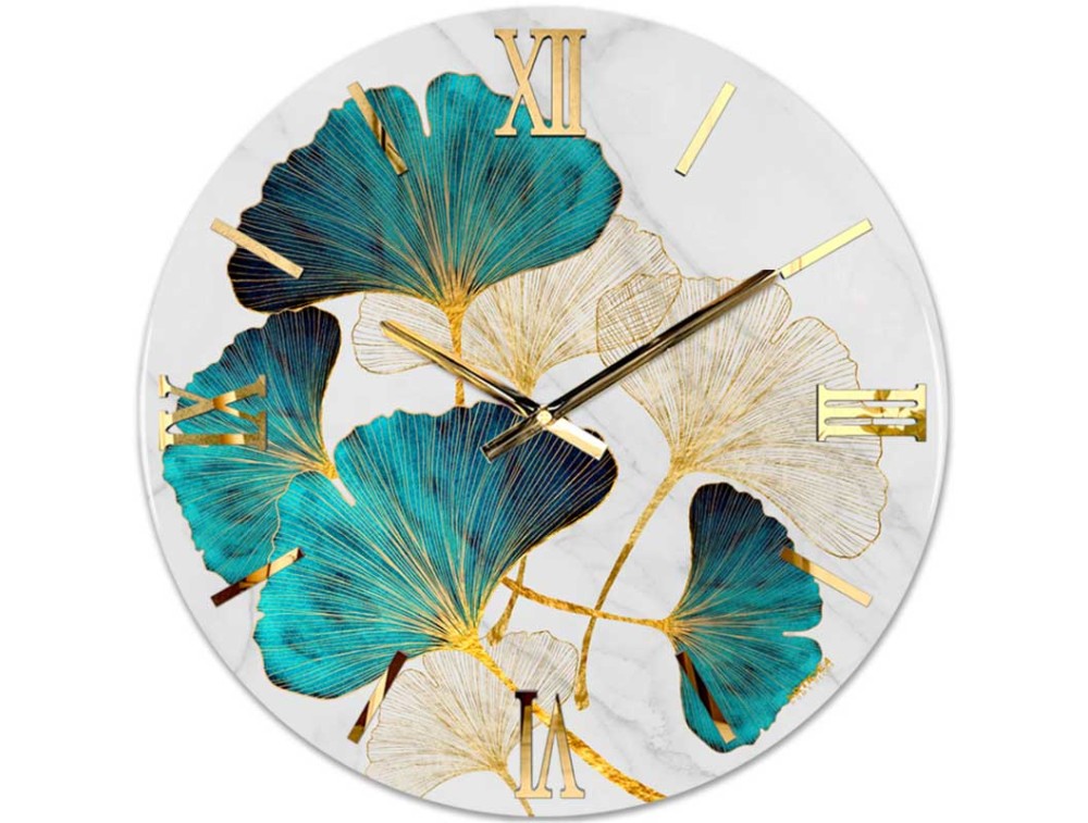Decorato a mano in ogni dettaglio per offrire un prodotto unico e originale. Ogni fase, dalla decorazione alla rifinitura fino all’assemblaggio, è eseguita artigianalmente in Italia, rendendo ogni pezzo irripetibile: eventuali piccole imperfezioni testimoniano l’autenticità della lavorazione. La base in legno è rivestita con resina epossidica trasparente, resistente ai raggi UV, e impreziosita da eleganti motivi vegetali con foglie in tonalità blu petrolio e oro. Numeri romani in plexiglass oro specchiato e lancette dorate in metallo completano il design