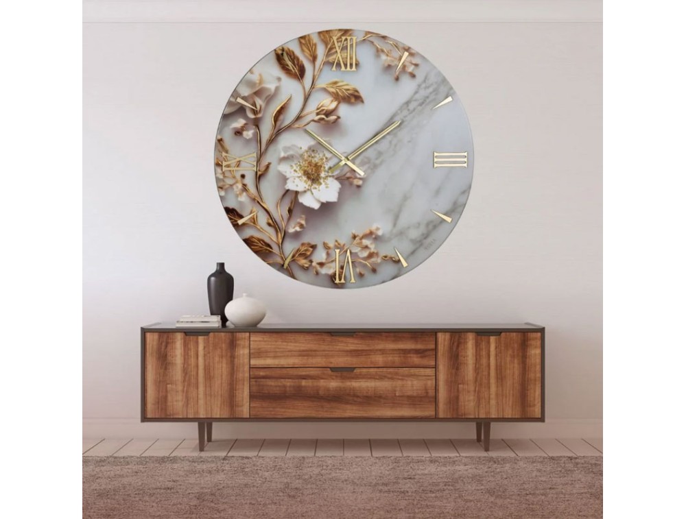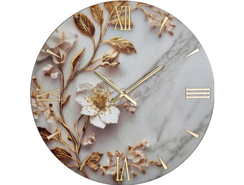 Realizzato a mano in Italia per chi desidera un elemento decorativo scenografico e ricercato. La struttura in legno è rivestita da una colata di resina epossidica trasparente, resistente ai raggi UV per mantenere nel tempo la brillantezza dei dettagli. Il decoro floreale in rilievo, composto da petali bianchi, foglie dorate e applicazioni in foglia oro, crea un effetto elegante e armonico. I numeri romani in plexiglass specchiato oro e le lancette dorate in metallo donano un tocco contemporaneo a questo orologio da parete dallo stile distintivo.