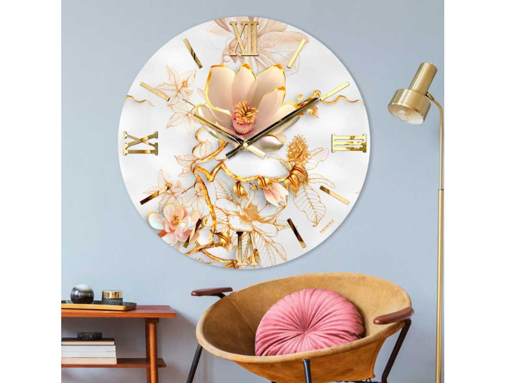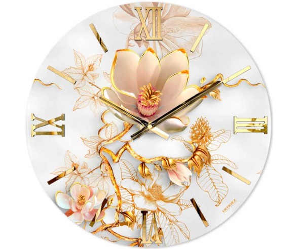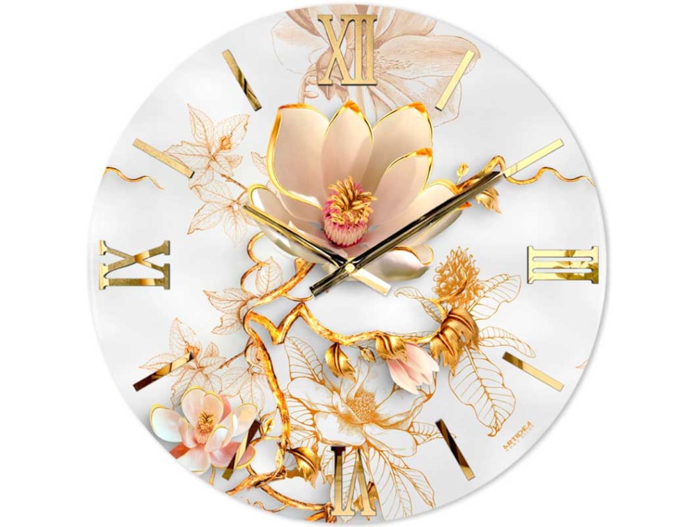 Delicato, elegante e tridimensionale, con un forte tema floreale. Orologio circolare con quadrante lucido, decorato a mano con foglia oro e numeri sovrapposti in Plexiglass lucido con effetto specchio. Lancette in metallo lucido. Realizzato artigianalmente in Italia con base in legno e resina colata lucida.