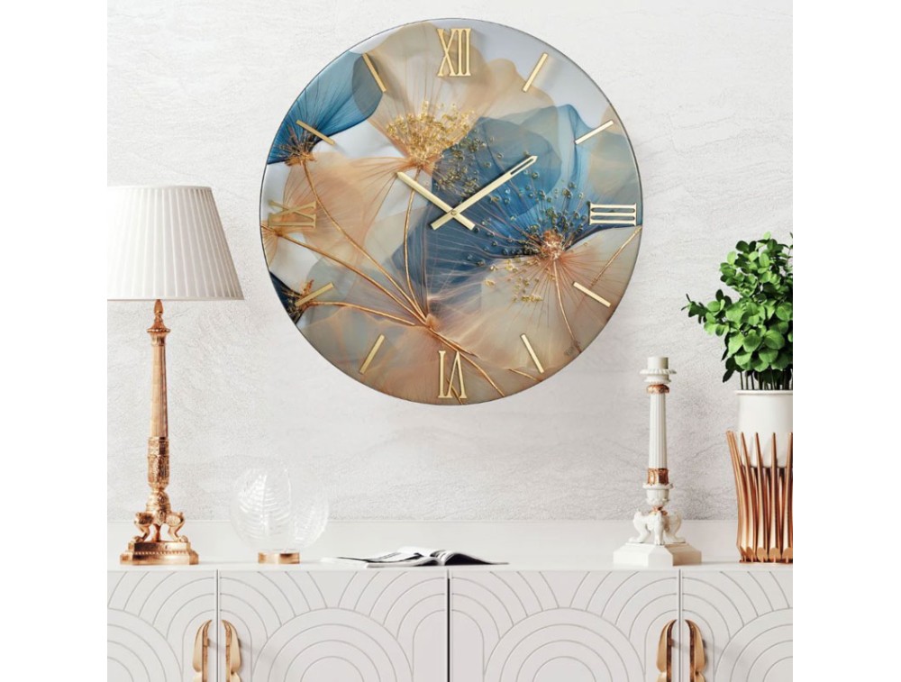 Orologio circolare con quadrante lucido, decorato interamente in Italia a mano con foglia oro e numeri sovrapposti in Plexiglass lucido con effetto specchio. Lancette in metallo lucido. È perfetto per ambienti che richiedono un tocco di colore e lusso discreto, come un soggiorno, una hall, una camera da letto o un ingresso elegante