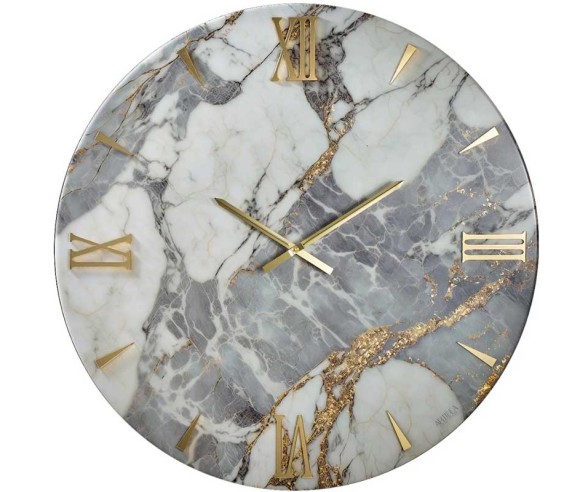 Elegante e versatile, ideale per ambienti moderni che desiderano un elemento decorativo ricco di dettagli. Realizzato su solida base in legno HDF e presenta una superficie in resina effetto marmorizzato dalle sfumature avorio e grigio perla, attraversata da raffinate venature impreziosite da decori in foglia oro. I numeri romani in plexiglass specchiato oro si fondono con armonia nel disegno, mentre le lancette in metallo cromato dorato aggiungono luminosità e precisione. Il meccanismo Made in Italy assicura qualità, completando un grande orologio da parete dal forte impatto estetico