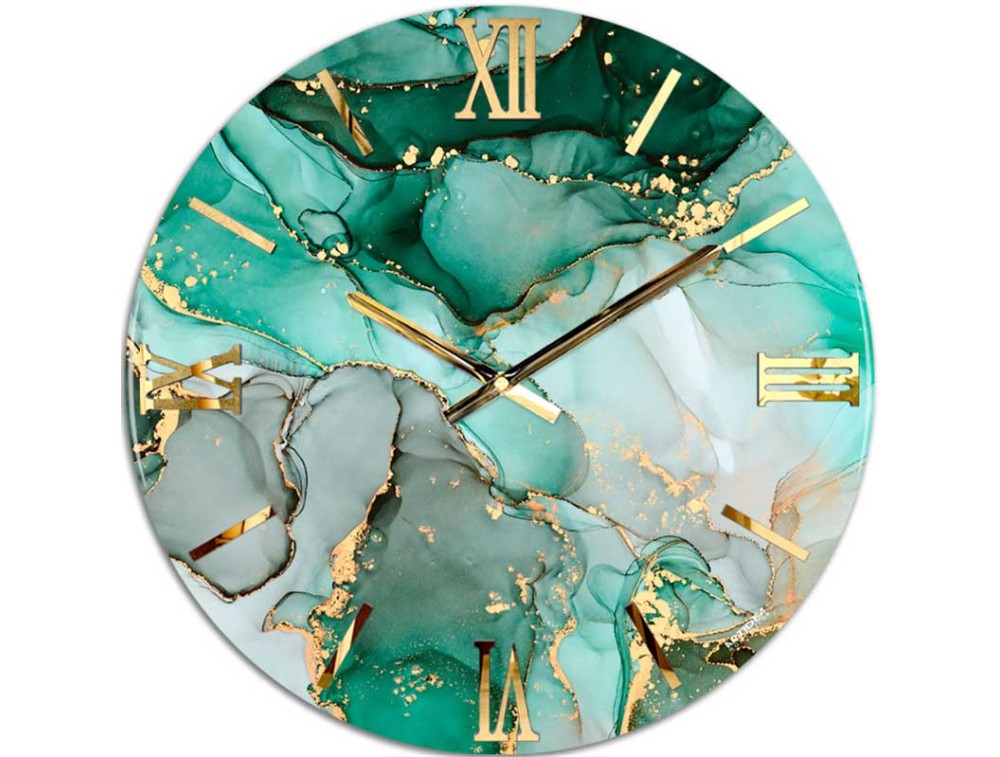Orologio da parete artigianale, si distingue per il suo stile particolare e la forte presenza decorativa. Realizzato in Italia con maestria, unisce una base in legno a una colata di resina epossidica effetto marmo verde petrolio, dal tono profondo e raffinato. La superficie è impreziosita da applicazioni in foglia oro che donano luminosità e contrasti materici eleganti. I numeri romani in plexiglass oro specchiato e le lancette in metallo dorato completano un'estetica moderna e ricercata. Questo orologio da parete moderno con elementi metallici è ideale per ambienti spaziosi che richiedono un elemento scenografico.