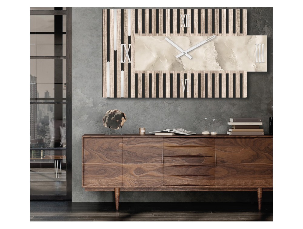 Dal design allungato e dalla forte personalità visiva, questo grande orologio da parete rappresenta un connubio tra eleganza moderna e gusto materico. L'inserto centrale in resina lucida effetto marmo beige amplifica la luminosità del quadrante, esaltandone i volumi. La spedizione è gratuita e la garanzia di 2 anni.