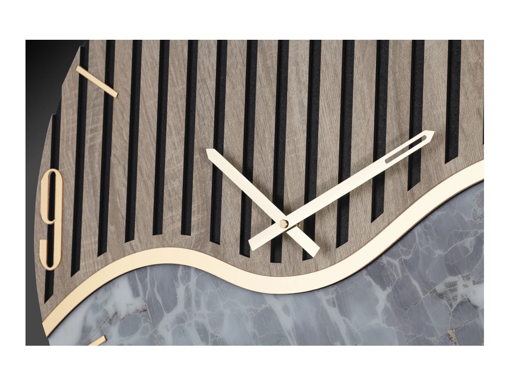 Elegante orologio in legno cannettato dalla forma circolare, arricchito da dettagli unici. Applicazione laterale con stampa di alta qualità con venature in effetto marmo, lancette lucide, numeri in plex specchio e meccanismo di movimento made in Italy. Per cucina, salotto, ingresso e camera da letto.