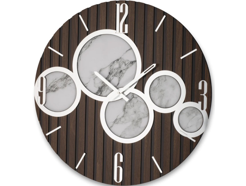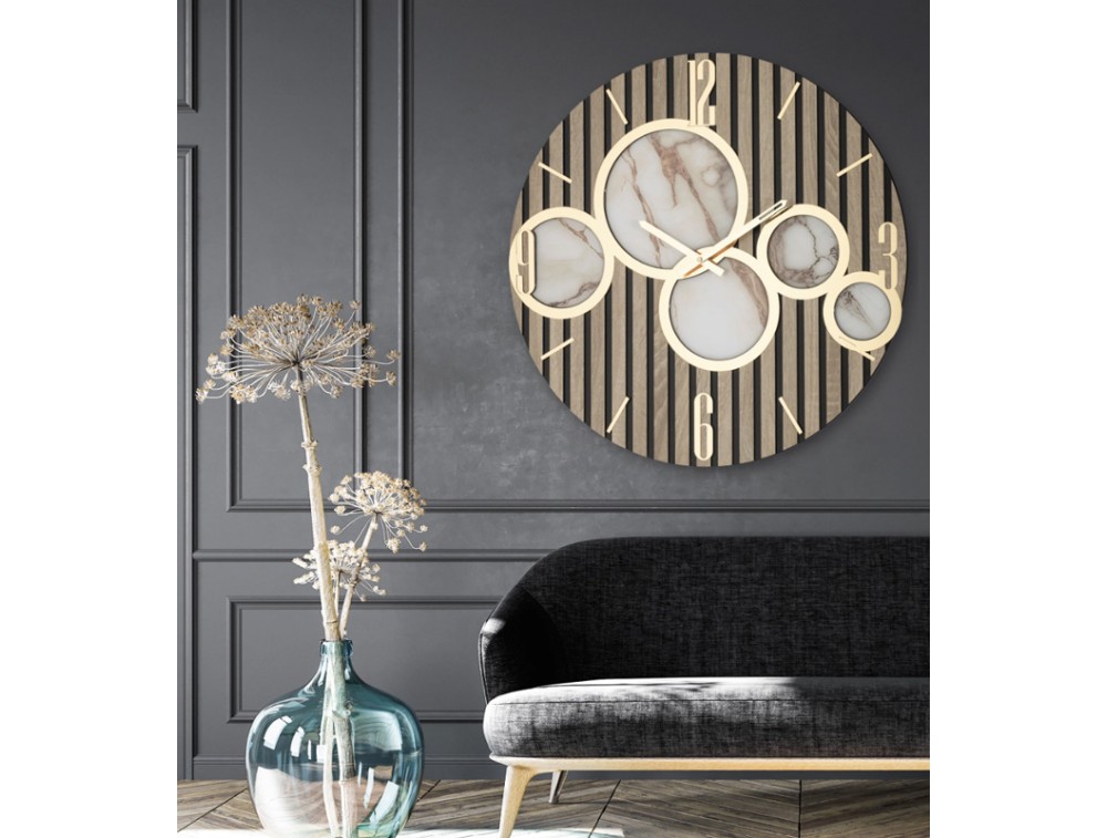 Elegante orologio in legno cannettato dalla forma circolare, arricchito da dettagli unici . Applicazione laterale con stampa di alta qualità con venature in effetto marmo, lancette lucide, numeri in plex specchio e meccanismo di movimento made in Italy. Per cucina, salotto, corridoio e camera da letto.