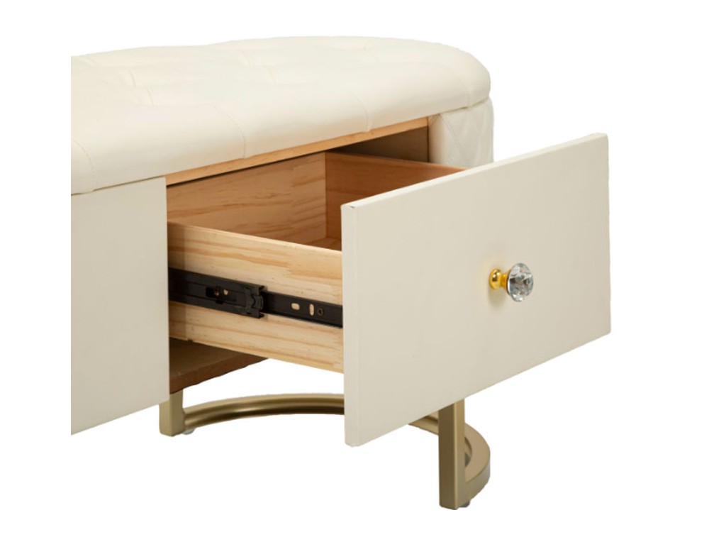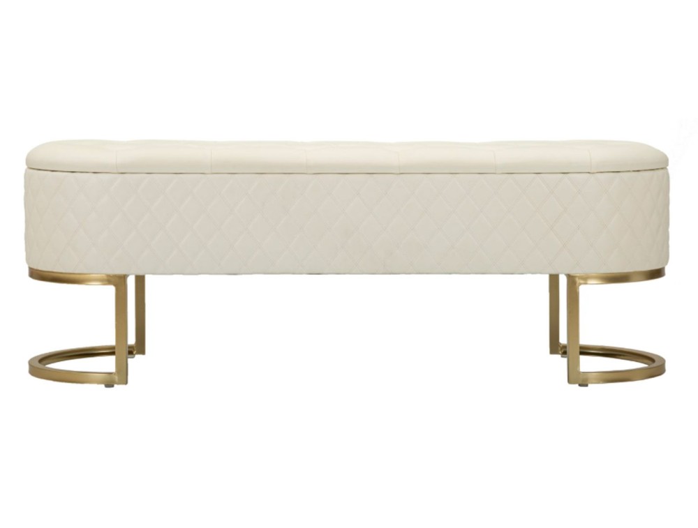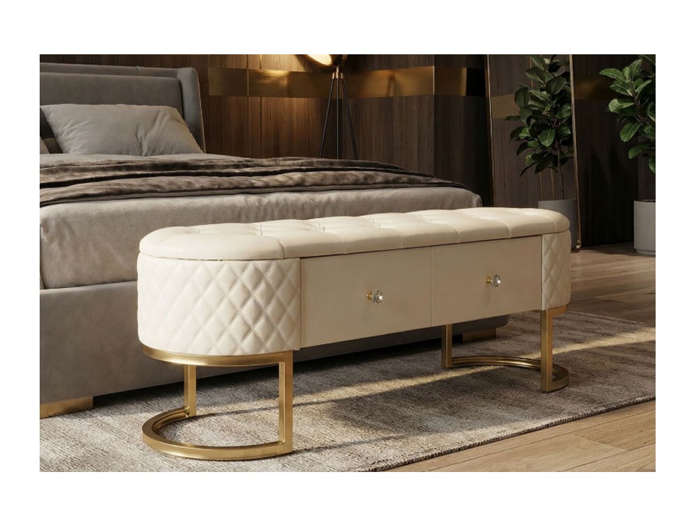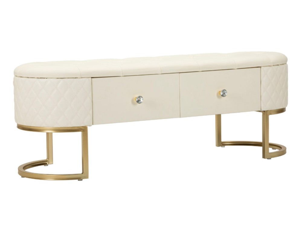 Panca elegante e funzionale con cassetti, rivestita in simil pelle trapuntata, con gambe circolari in metallo dorato che abbracciano la sua forma distintiva. Realizzata in legno di pino, pannello di fibra a media densità, metallo e plastica.