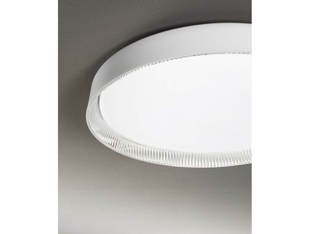 La plafoniera Kaos è realizzata in fibre plastiche bianche. Perfetta per bagno, è abbellita da un bordo interno diamantato, mentre un diffusore in acrilico bianco satinato completa l'elegante design. Il sistema di regolazione del colore della temperatura tramite un interruttore interno, offre un'illuminazione personalizzabile